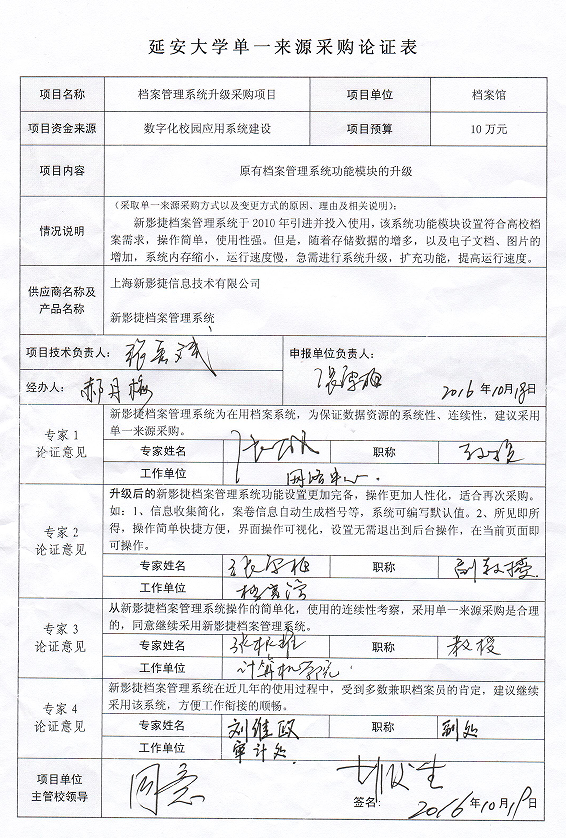 beat365唯一官网档案管理系统升级采购项目拟对原有档案管理系统功能模块进行升级。拟采取单一来源采购方式采购,由上海新影捷信息技术有限公司提供。现将有关情况向潜在供应商广泛征求意见。征求意见期限从2016年10月20日起至2016年10月22日止。潜在供应商对公示内容有异议的,请于公示期满后2个工作日内以实名书面(包括联系人、地址、联系电话)形式将意见反馈至beat365唯一官网国资处(联系电话:0911-2332042)和beat365唯一官网监察处(联系电话:0911-2332090)。