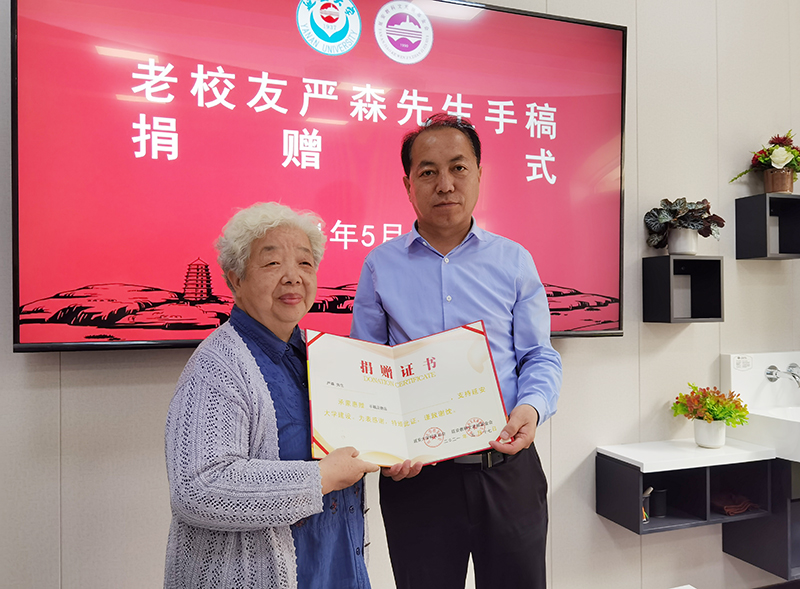 捐赠仪式上,严森的女儿严苏建深情讲述了父亲的生平往事,严苏华代表家属向学校捐赠了严森先生的手稿、照片、书籍等珍贵档案史料,校史馆馆长李霞接受了捐赠。副校长付峰代表学校向严森家属颁发了捐赠证书。