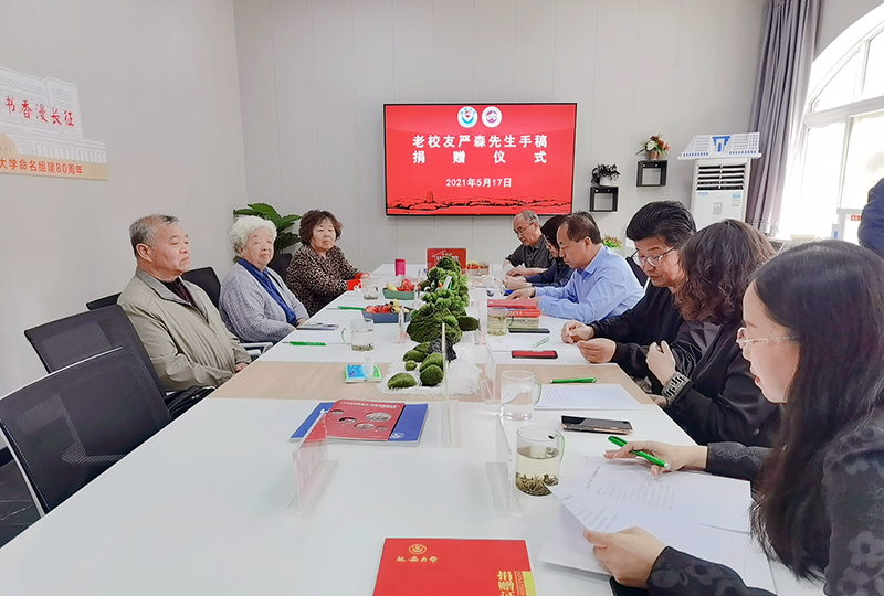 本网讯 5月17日下午,已故校友严森子女严苏华、严苏建、严苏会在杨家岭校区“校友之家”向学校捐赠了其父手稿等物品。beat365副校长付峰,党政办、发展规划处、对外交流与合作处等部门相关负责同志参加了捐赠仪式。