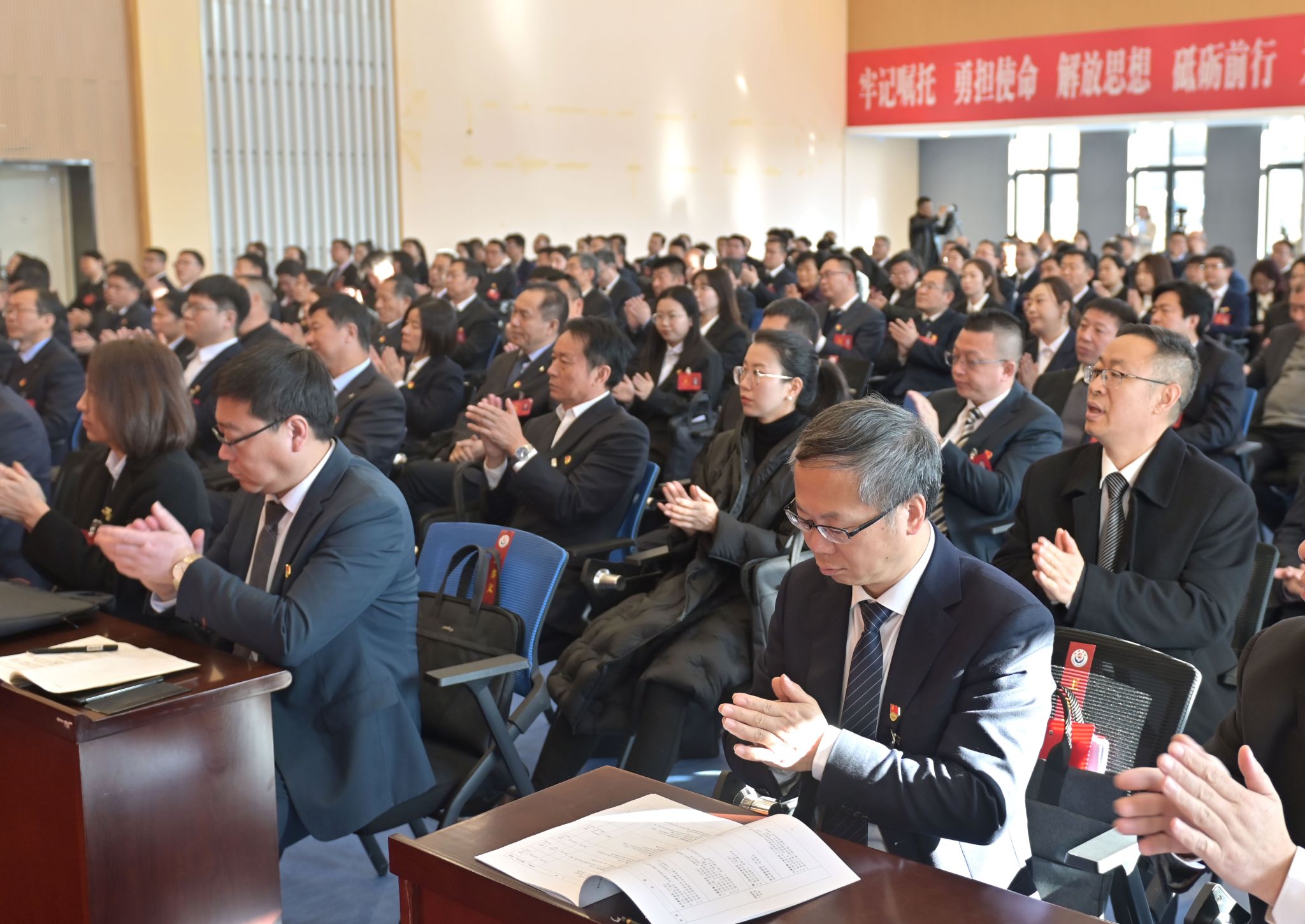 大会会场庄严肃穆,主席台上方金黄色党徽位居正中,十面鲜艳的党旗分列两侧,气氛热烈隆重。