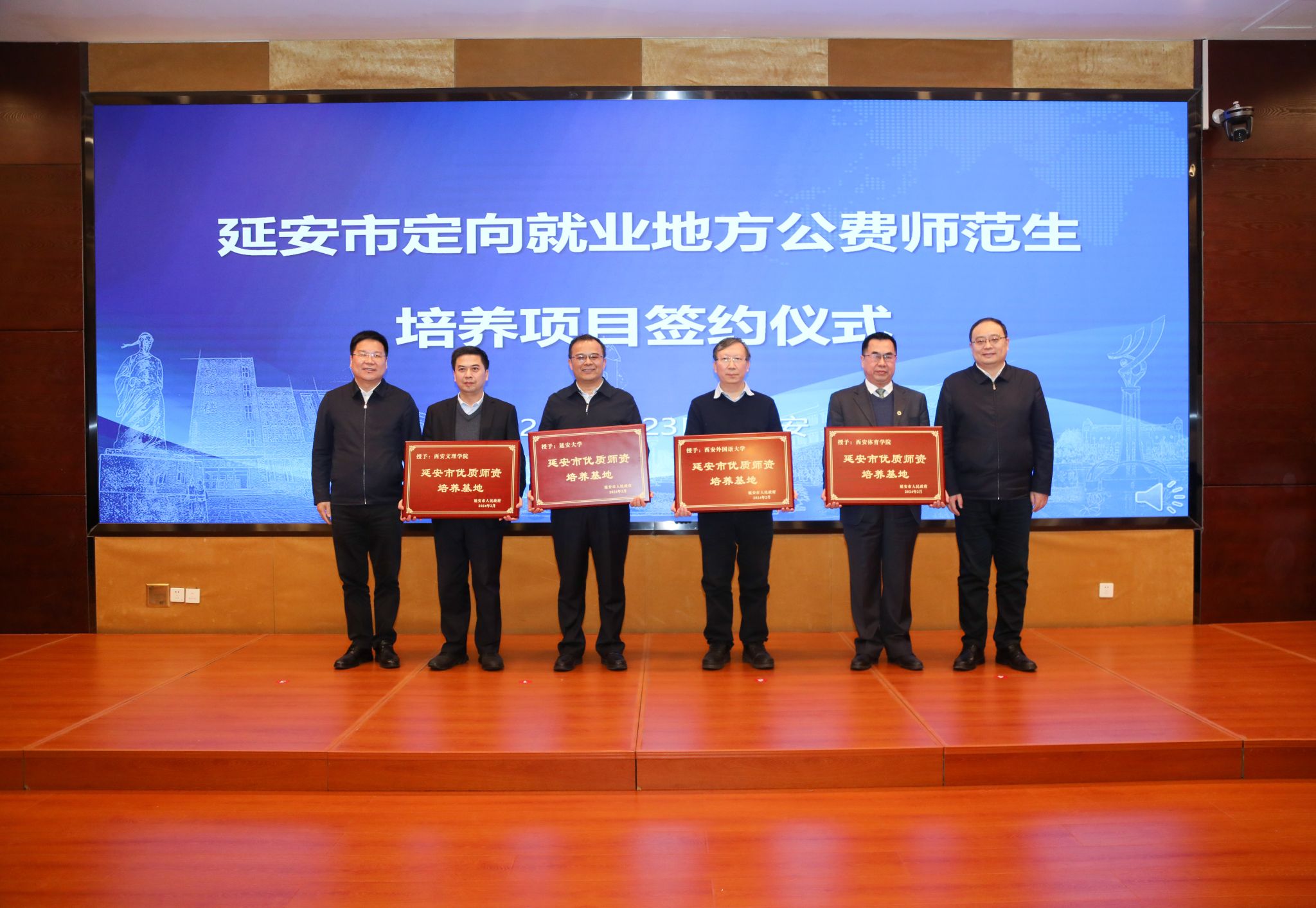 beat365党委副书记、校长奚家米,西安文理学院、西安体育学院、西安外国语大学的有关负责同志参加了签约仪式。延安市政府与四所高校分别签订了地方公费师范生合作培养协议,王树声厅长、严汉平市长向四所高校授予“延安市优质师资培养基地”牌匾。