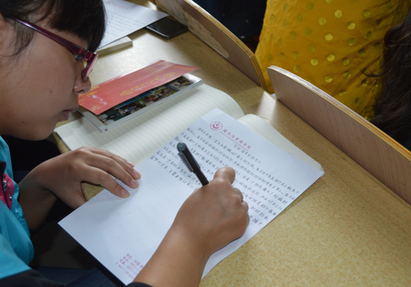 “这里的学长学姐都很热情,让我感受到了家的温暖。”刚接受了校徽的经济学14胡倩倩同学激动地说。“虽然是雨天,但行走在延大的校园里,让我感受到了历史的厚重感。”“立身为公,学以致用,我们将在它的指引下前行。”7位学生代表一一表述着自己的入学感言。