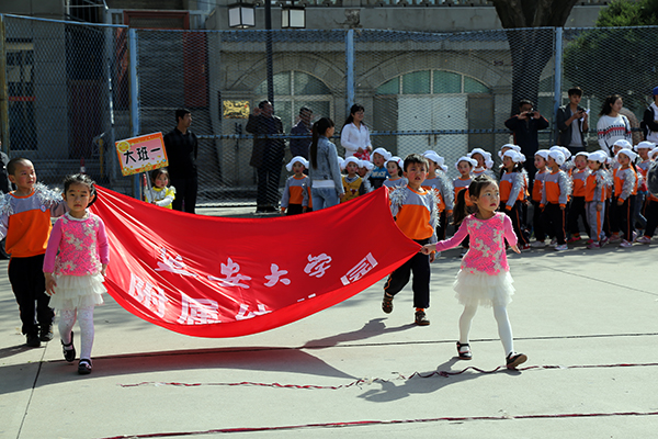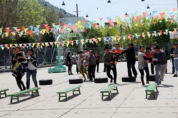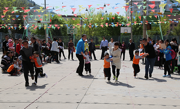 表演结束后,亲子运动会相继举行。首先进行的是小班的抱皮球比赛,别看他们才三岁,个个争先恐后、勇往直前。中班小朋友的亲子游戏《袋鼠跳》、《捉尾巴》、《猴子爬树》三个项目都有极强的趣味性,在比赛中为了给孩子争取取胜时间,有的家长把鞋子跑掉了也不落后。随着每一次比赛开始,加油呐喊声不断、此起彼伏——孩子们为爸爸妈妈喊加油!爸爸妈妈给孩子助阵,将运动会的气氛推向小高潮。