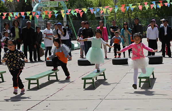 大班小朋友们在《过小桥》、《跳轮胎》、《大脚绑小脚》和《夹气球》这些项目中,家长和孩子们配合默契。运动器材的巧妙选择,体现了老师们的心灵手巧的特点,彰显了他们的智慧。在这些亲子游戏中孩子们或萌态可掬、或身手矫捷。钻、拉、爬、跳、跑等乐在其中……