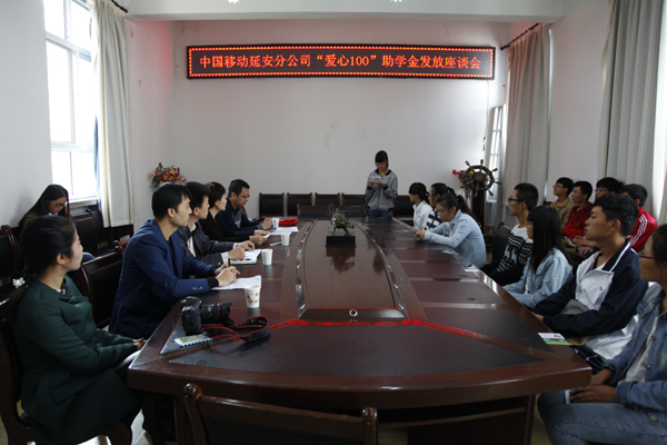 本网讯 9月30日上午,中国移动延安分公司“爱心100”助学金发放座谈会在如心楼三楼会议室举行。学生处副处长王彦杰、学生资助管理中心主任肖金学、中国移动延安分公司综合办主任刘春琳等,以及18名beat365受助学生参加了座谈会。会议由学生处副处长王彦杰主持。
