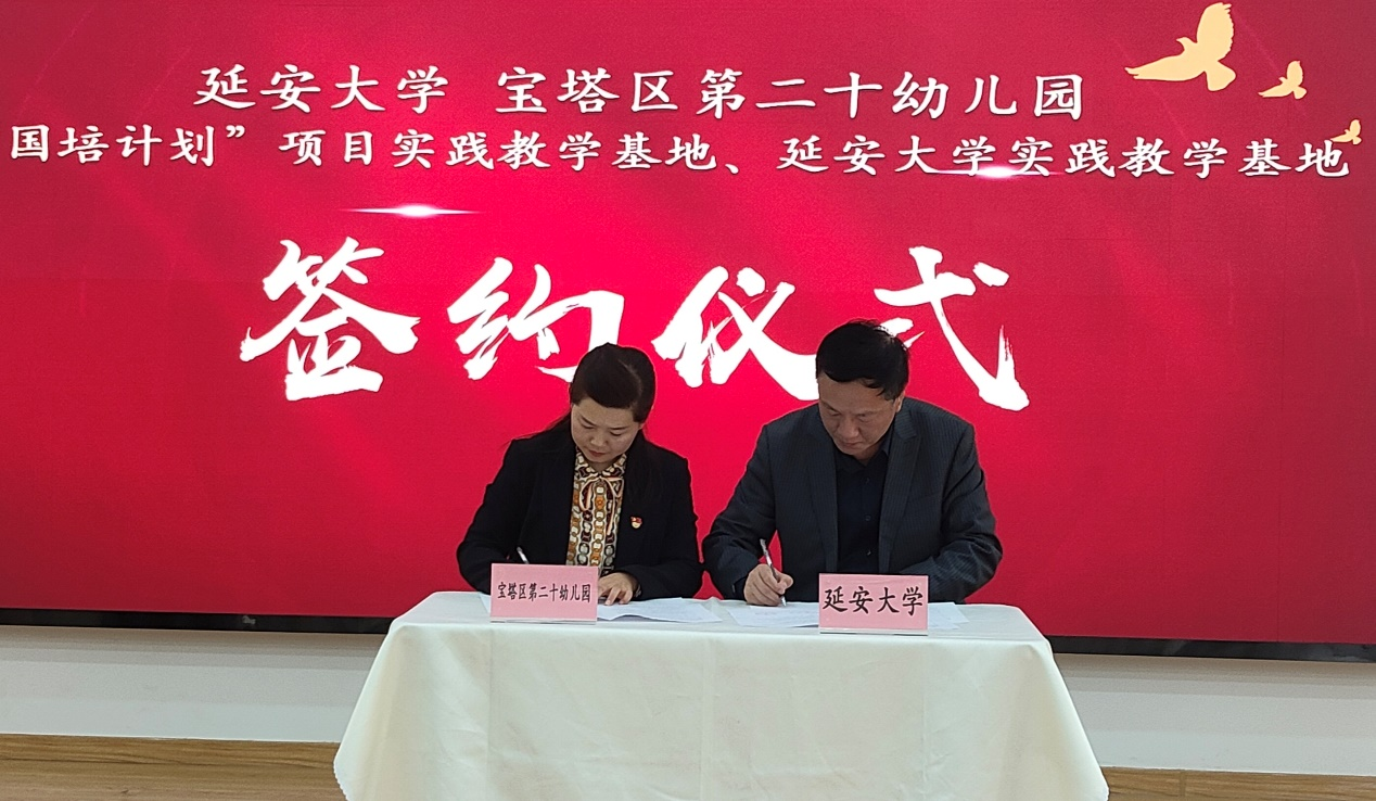 本网讯 为落实学校第七次党代会“1195”工作布局和“3331”总体部署,加强校地合作融合,深化高校与幼儿园协同育人机制,构建学前教育高质量发展共同体,4月17日上午,教科院与宝塔区第二十幼儿园“携手共进,共创未来”国培计划项目和学前教育专业实践教学双基地签约暨授牌仪式在宝塔区二十幼举行。教科院长刘瑞儒、副院长冯晓江、学前教育系主任李丽娥、延安市教育教学研究中心主任冯付军、宝塔区教育体育局局长郭颖健、延安市宝塔区人民政府教育督导室主任白富宏、二十幼校长焦忠玲及教师代表共同出席了签约授牌仪式。活动由白富宏主任主持。