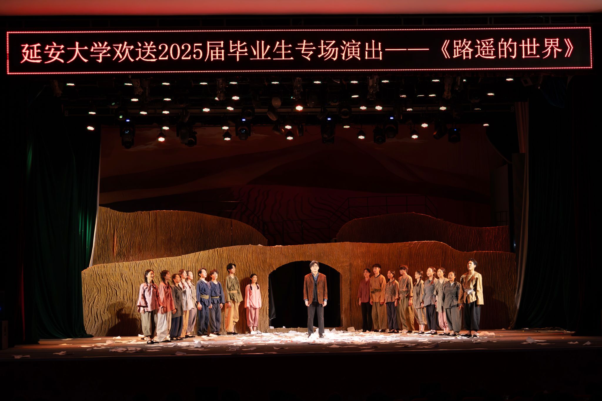 此次《路遥的世界》毕业演出,是一堂生动的红色文艺育人实践课,2名前话剧团演员、4名2025届毕业生、30余名不同学院、不同专业在校生共同参与演出,充分展示了延大青年的精神风貌和青春风采,演出也让路遥精神在新一代延大人中得到了更好的传承和弘扬,为校园文化建设注入了新的活力。