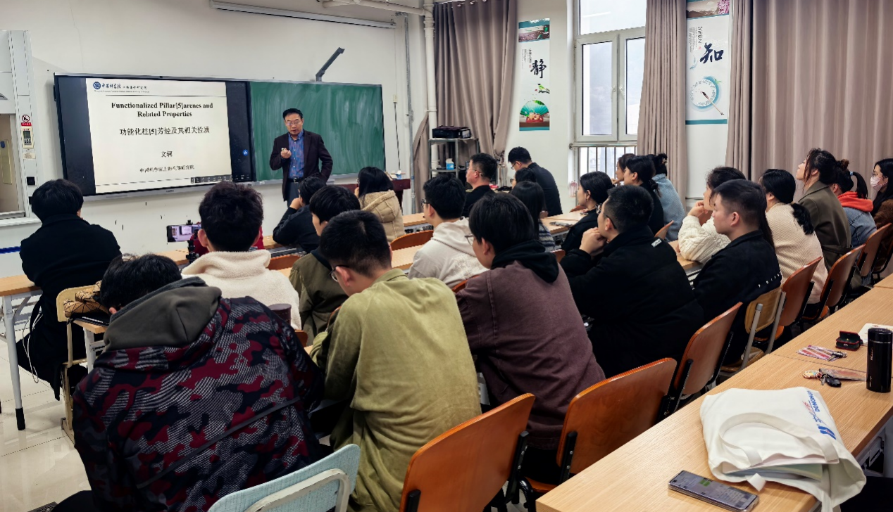 报告会上,文珂研究员做了题为“功能化柱[5]芳烃及其相关性质”的报告。文珂研究员详细地介绍了柱[5]芳烃的功能化、主-客体性质、基于柱[5]芳烃机械互锁分子的合成以及柱[5]芳烃功能材料的应用。文珂研究员语言通俗易懂,深入浅出,内容丰富详实、科学严谨,引起与会师生浓厚兴趣和热烈讨论,耐心地回答了师生们的疑问。这场报告不仅开阔了大家的学术视野,并为今后的科研工作提供了重要的指导意义。