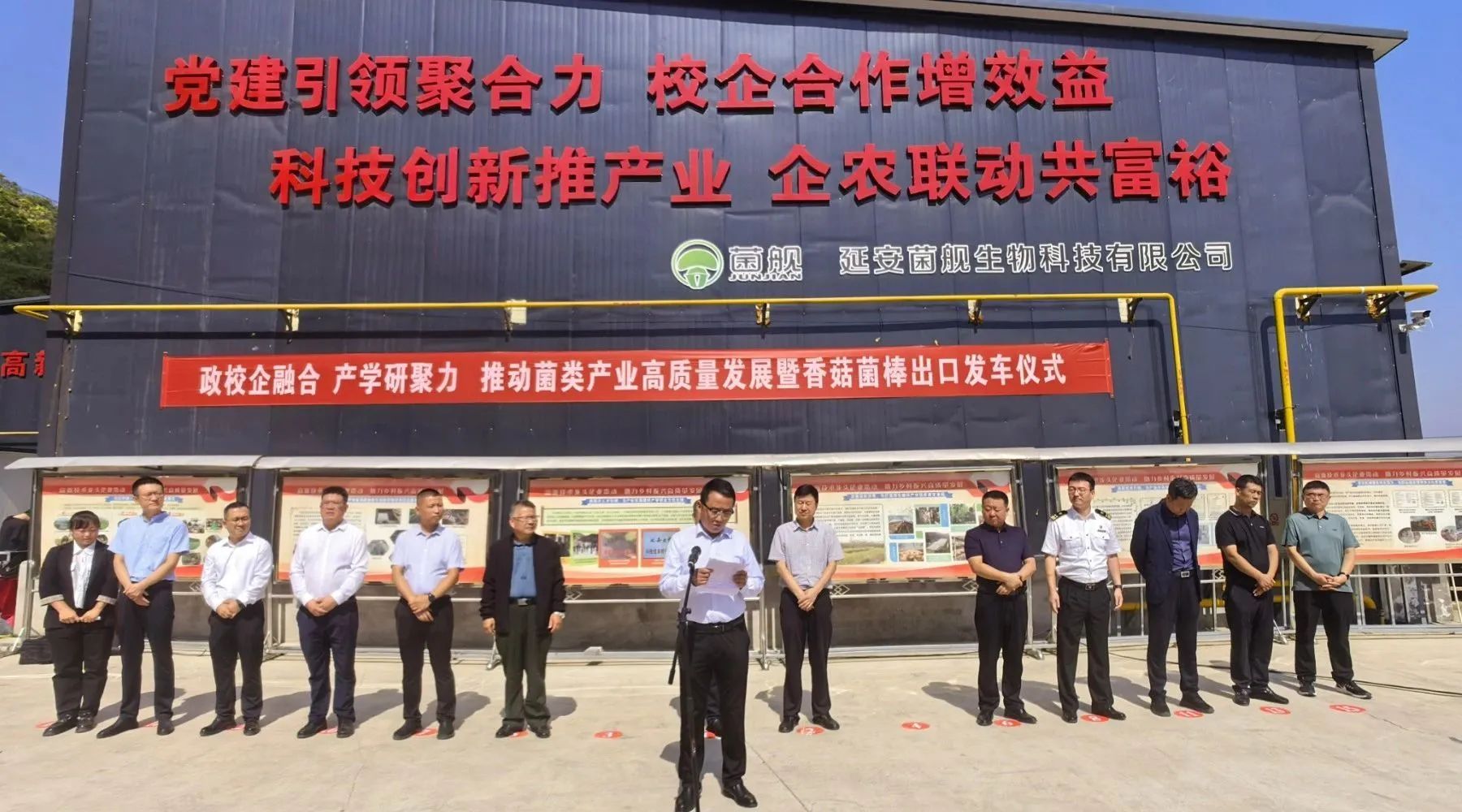 发车仪式上,河庄坪镇党委书记刘震做了精彩致辞,延安菌舰生物科技有限公司董事长高瑜对产业发展及香菇菌棒出口进行简要介绍,生命科学学院院长张向前介绍了beat365食用菌产学研合作情况;宝塔区政府副区长野根利、生命科学学院党委书记白亚军和延安海关副关长乔科三方对香菇菌棒进行出口封柜。延安菌舰香菇菌棒正式起运,走出国门,开拓海外市场,实现延安市菌类产品对外贸易自营出口零的突破!