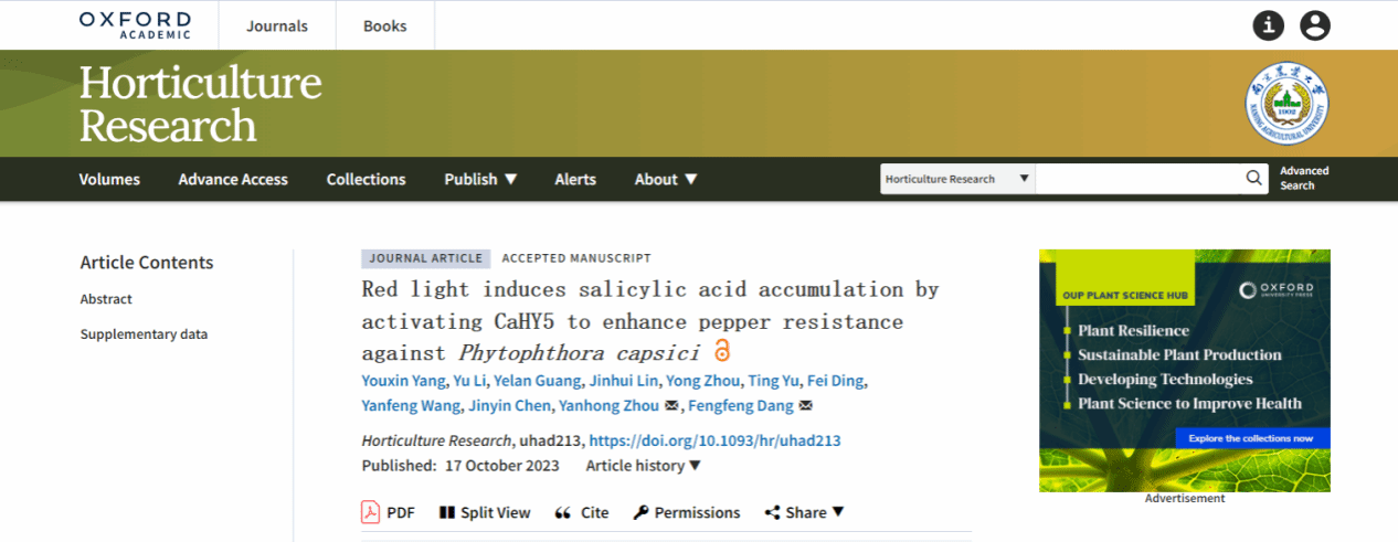 近日,beat365生命科学学院设施蔬菜团队党峰峰博士与合作者在园艺领域的权威期刊Horticulture Research杂志(中科院一区TOP,中国科技期刊卓越行动计划领军类期刊)发表了题为“Red light induces salicylic acid accumulation by activating CaHY5 to enhance pepper resistance against Phytophthora capsici”的研究论文。该研究发现,红光通过激活光信号转导途径中关键转录因子CaHY5,调控下游水杨酸(Salicylic acid,SA)合成相关基因的表达,从而提升内源SA含量来提高辣椒对疫病的抗性。该研究成果为开发基于光质的辣椒疫病防控技术提供了理论依据。我院党峰峰博士为本文通讯作者,浙江大学周艳虹教授为本文共同通讯作者,江西农业大学杨有新博士为本文第一作者,我院王延峰教授、福建省农科院林金辉博士和聊城大学丁飞博士等参与了该工作。
