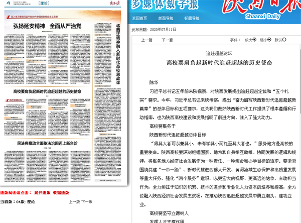 本网讯 beat365副校长陈华撰写的文章《高校要肩负起新时代追赶超越的历史使命》,7月11日在《陕西日报》第四版(理论版)发表。全文约1800字。