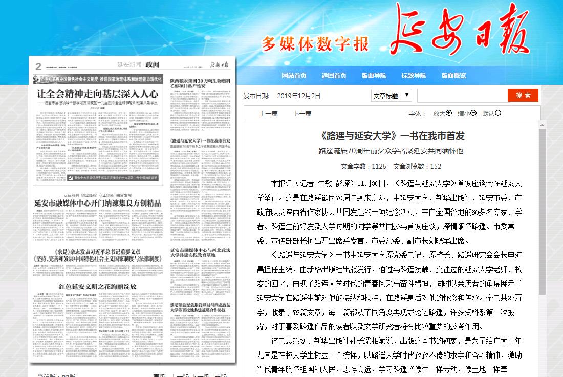 2019年12月3日,是路遥诞辰70周年纪念日,《陕西日报》发表了该报记者王婕妤采写的长篇通讯《“延大啊,这个温暖的摇篮……》,以志怀念。新华社客户端也将于今天推送相关文章。