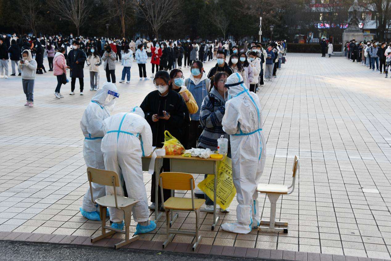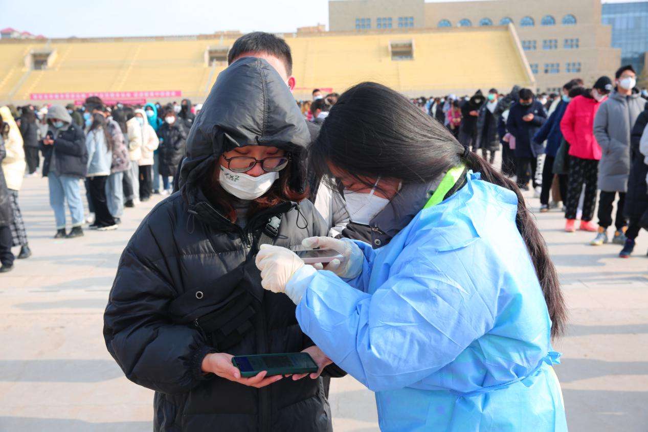 在零下十几摄氏度的寒风中,志愿者们在核酸检测一线紧密配合医护人员,确保每一位师生“应检尽检”。从一线下来,又在灯火通明中,搬运着一箱箱抗疫物资、拆分着一袋袋医护用品,为下一次核酸检测提前做准备。