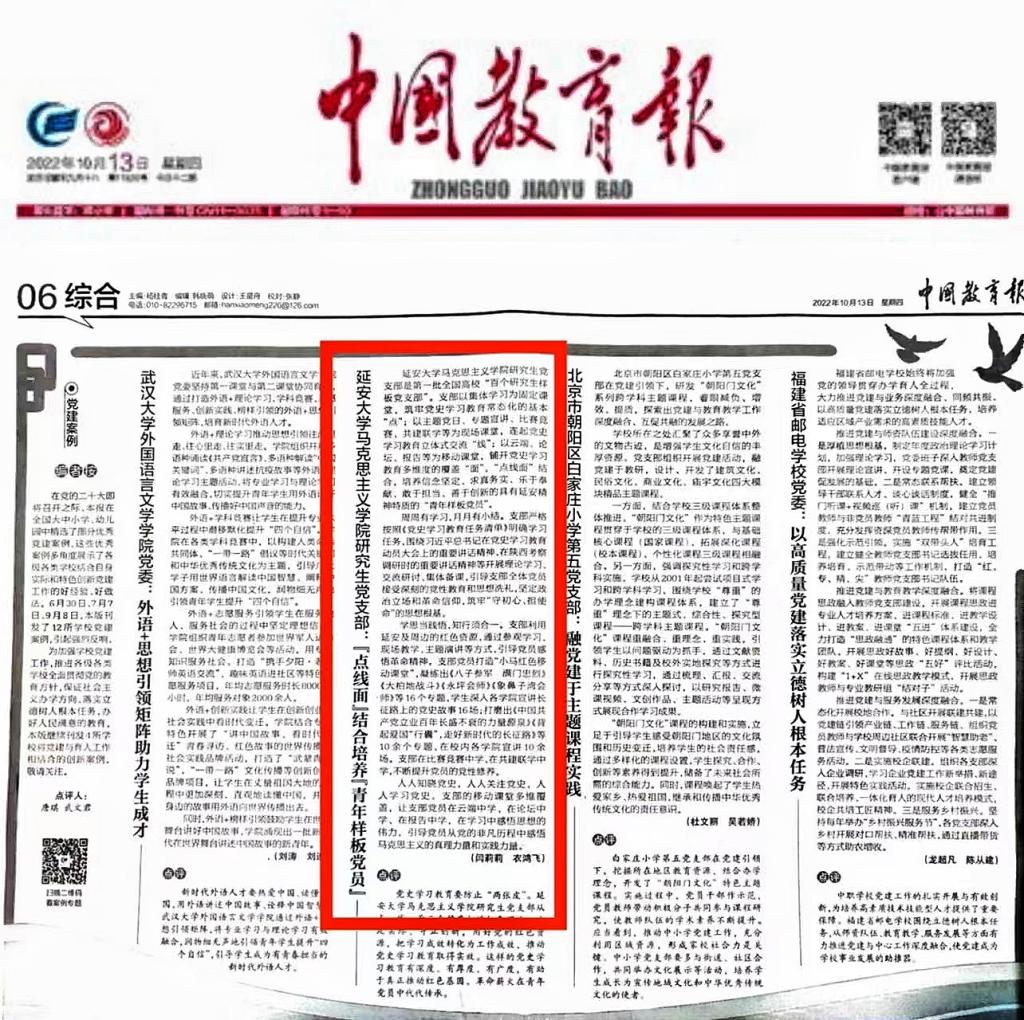 《中国教育报》10月13日第6版专题刊发beat365马克思主义学院研究生样板党支部的典型案例《“点线面”结合,培养“青年样板党员”》。点评中指出:beat365唯一官网马克思主义学院研究生党支部用好了党的红色资源,把学习成效转化为工作成效,立体式地推进了支部党史学习教育务实求效,致力于培养“样板党支部”具有信念坚定、求真务实、敢于担当、乐于奉献、善于创新的延安精神特质的“青年样板党员”。这样的党史教育有深度、有厚度、有广度,很好地防止了学习、工作“两张皮”现象,有助于真正推动红色基因、革命薪火在青年党员中代代传承。