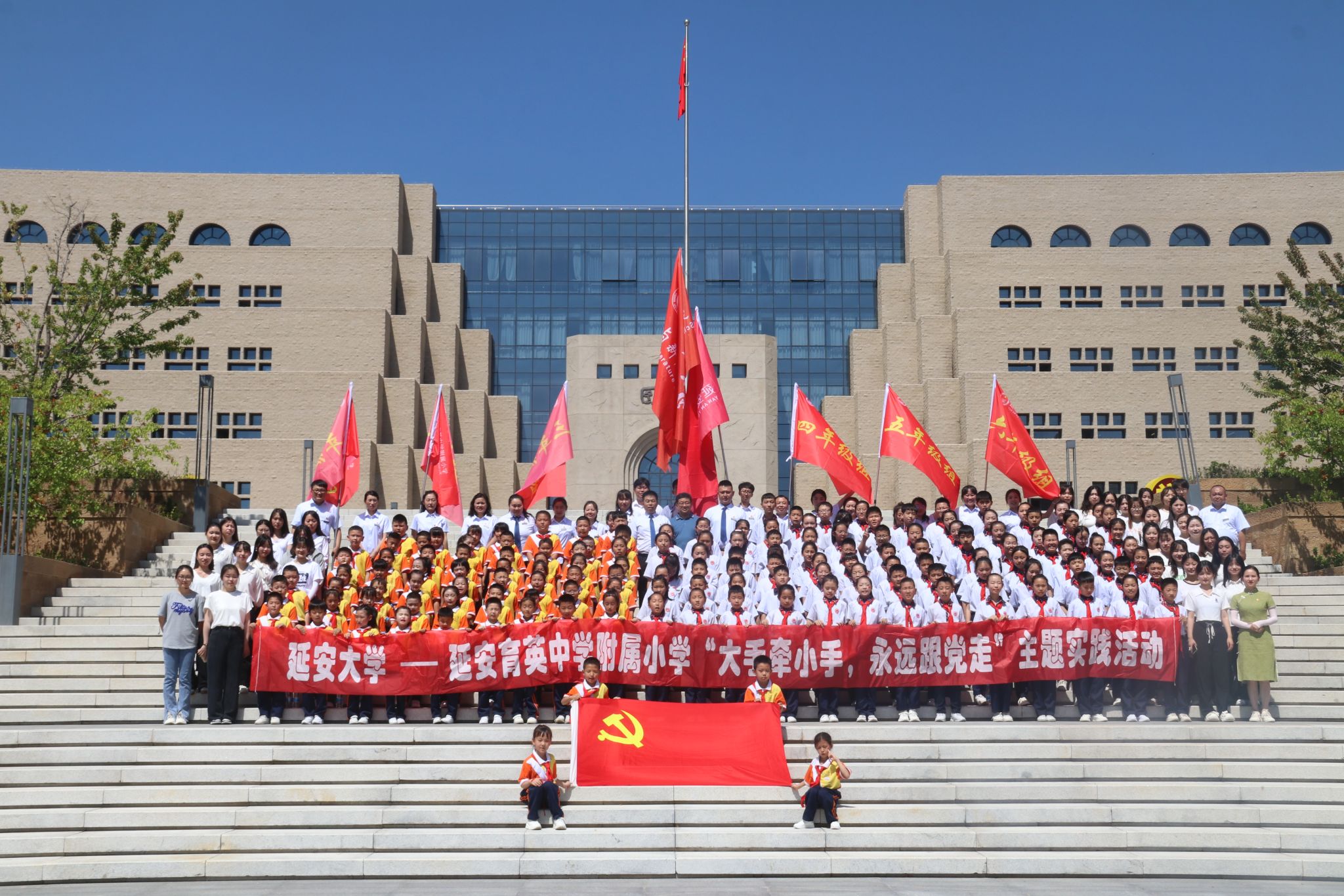 本网讯 为庆祝中国共产党成立102周年,全面贯彻落实党的二十大精神,落实立德树人根本任务,推进大中小学思政教育一体化建设,6月30日上午,beat365唯一官网文学院、图书馆与延安育英中学附属小学师生联合开展“大手牵小手,永远跟党走”主题党日活动。参加此次活动的有文学院党委书记党子奇,副书记张冰雁,研究生支部书记李朝琴;beat365唯一官网机关党委第十一党支部书记、图书馆副馆长贺知章,办公室主任徐显云;延安育英中学党支部书记、初中部校长于清涛,小学部校长高嘉徽,教务主任王路及两校师生200余人。