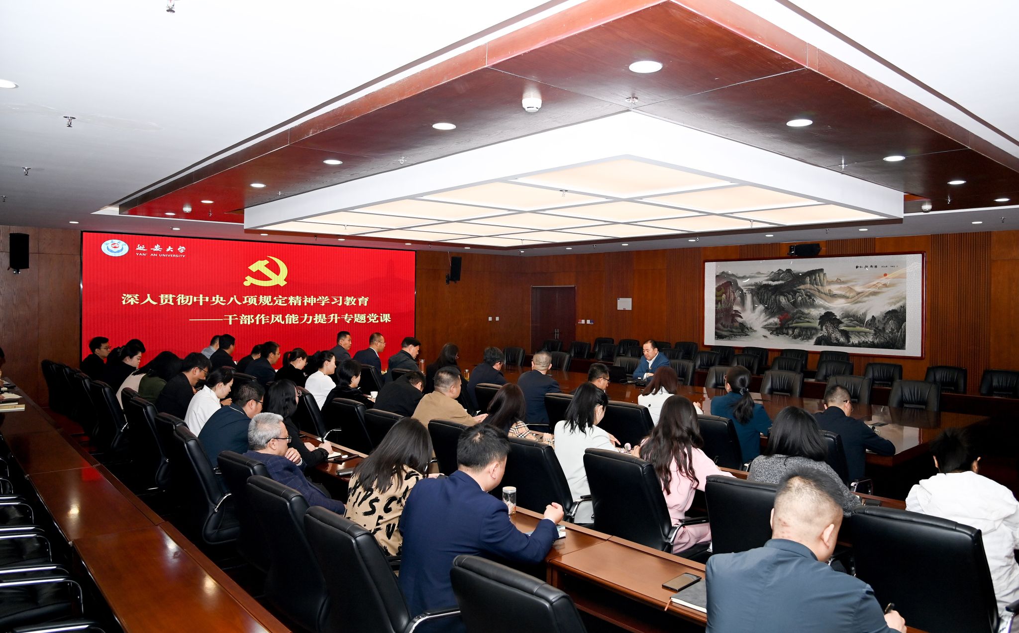 本网讯 按照学校党委关于开展深入贯彻中央八项规定精神学习教育的安排部署,以及深入实施“干部作风能力拓展年”活动要求,日前,校党委书记高子伟为机关党委党员、年轻干部讲授了《深入贯彻中央八项规定精神学习教育——干部作风能力提升》专题党课,机关党委部分党员干部参加,机关党委书记解文元主持。