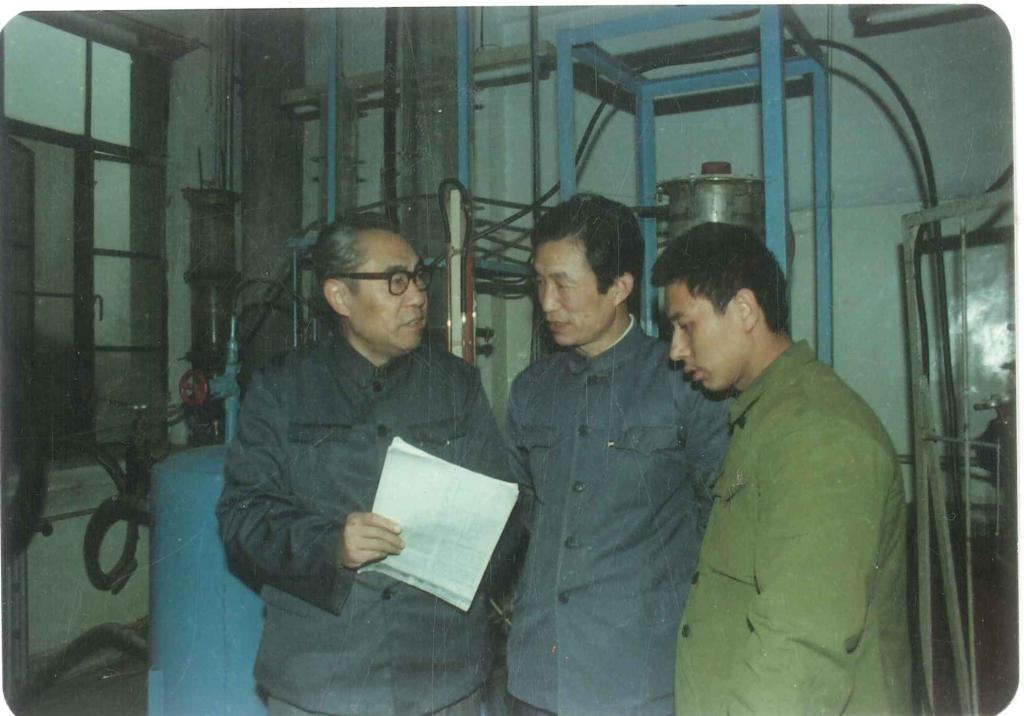 1989年7月王继武老师(右)与杨文选老师(中)、秦振平老师(左)做实验
