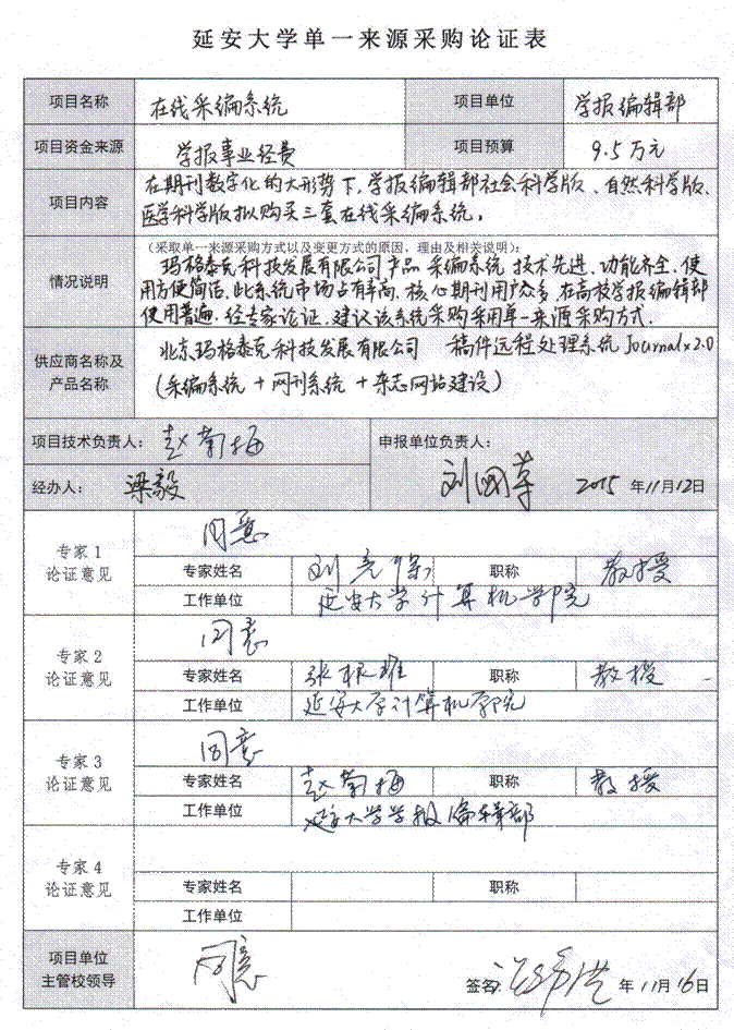 beat365唯一官网学报采编系统采购项目拟采购采编系统三套(社会科学版、自然科学版、医学科学版各一套)。拟采取单一来源采购方式采购,由北京玛格泰克科技发展有限公司提供。现将有关情况向潜在供应商广泛征求意见。征求意见期限从20151116日起至20151120日止。潜在供应商对公示内容有异议的,请于公示期满后2个工作日内以实名书面(包括联系人、地址、联系电话)形式将意见反馈至beat365唯一官网国资处(联系电话:0911-2332042)和beat365唯一官网纪委监察处(联系电话:0911-2332090)。