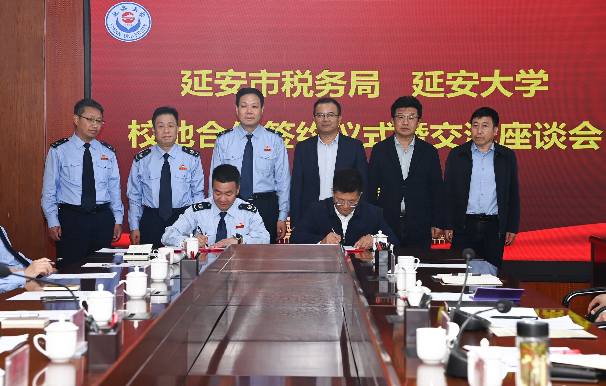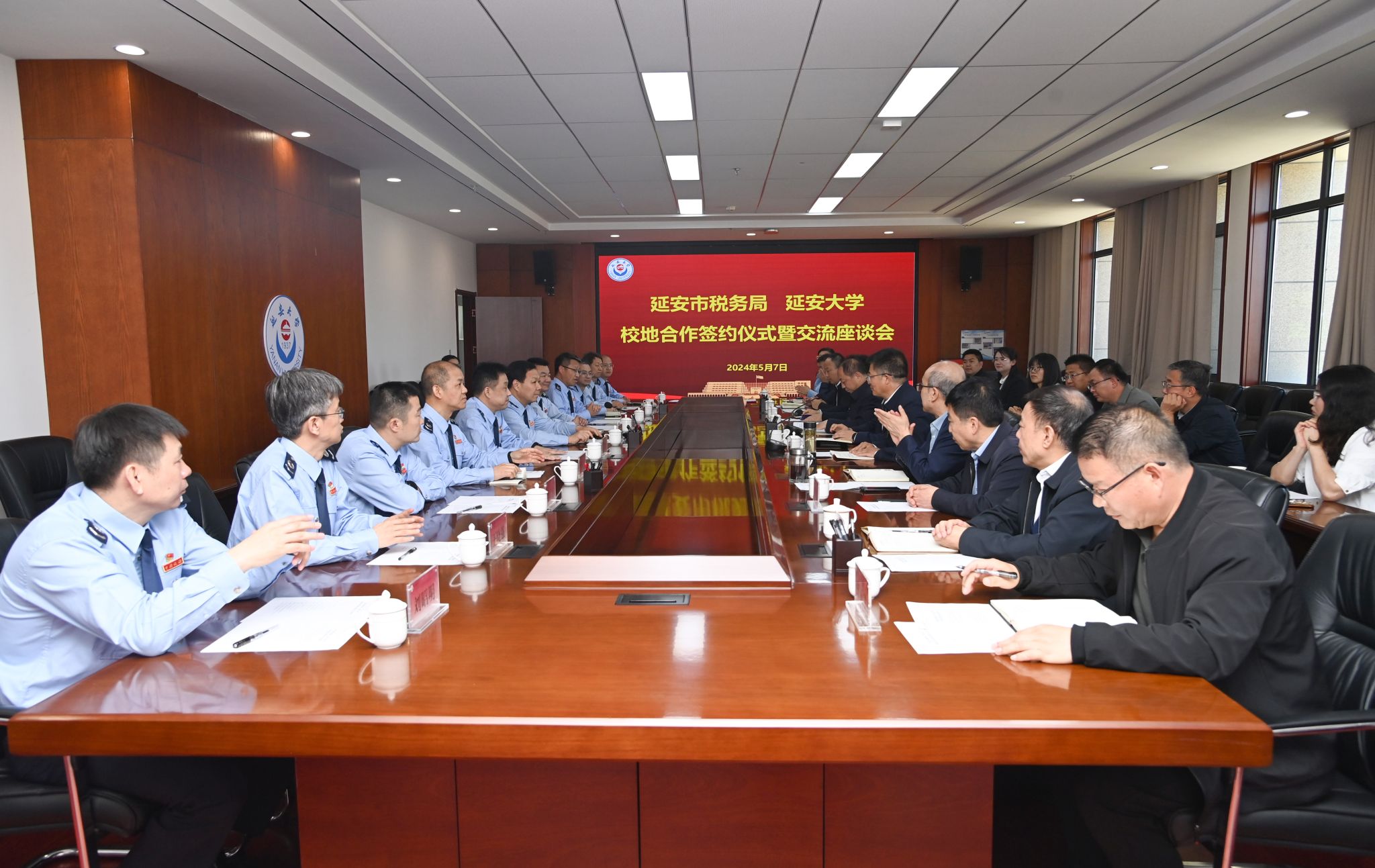 本网讯 5月7日上午,延安市税务局党委书记、局长史健一行11人来beat365考察交流,签约仪式及座谈会在beat365新城校区行政楼7楼会议室举行。校党委副书记、校长奚家米,校党委副书记杨伟宏,以及beat365相关部门、学院负责人及教师代表参加座谈会。会议由副校长付峰主持。