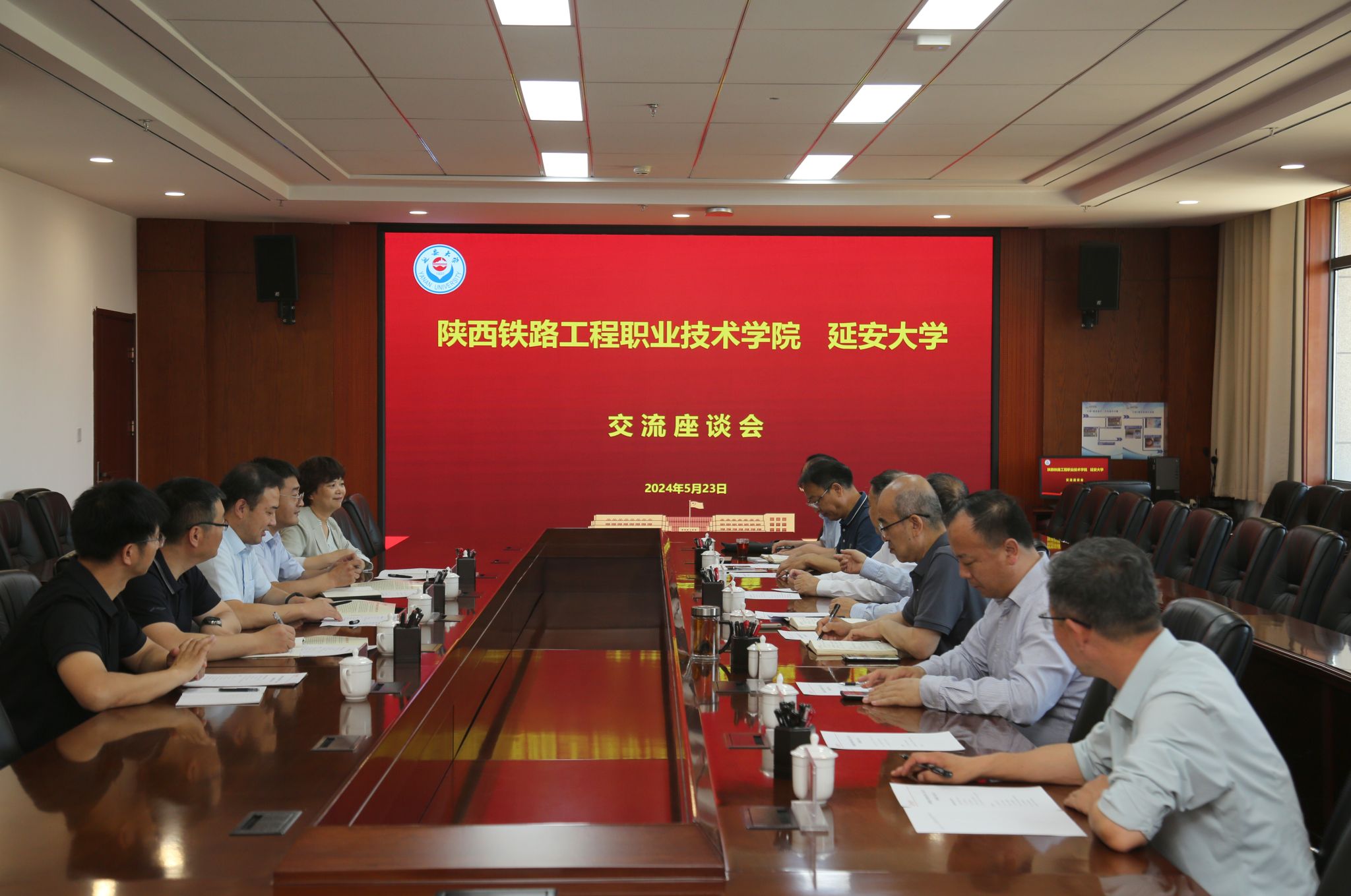 本网讯 5月23日上午,陕西铁路职业技术学院院长贺建锋一行来beat365考察交流,座谈会在新城校区行政楼七楼会议室召开。beat365总会计师范育琳,组织部、财务处、基建处、新校区办、泽东干部学院、马克思主义学院、经管学院等相关职能部门和学院负责人参加座谈会。