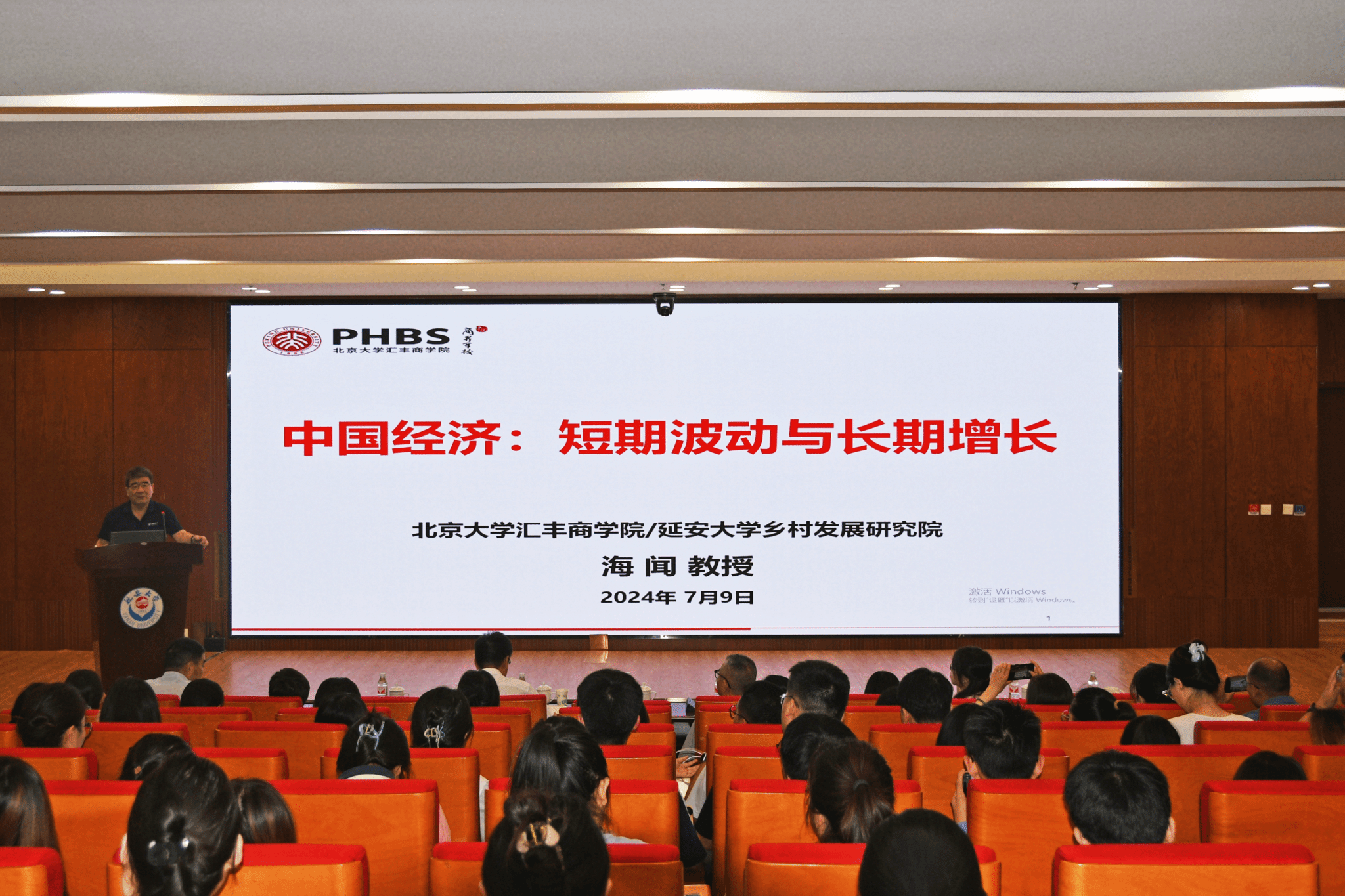 本网讯 7月9日,北京大学校务委员会副主任(原副校长)、汇丰商学院创院院长、beat365唯一官网乡村发展研究院院长海闻教授在行政楼一楼报告厅为beat365师生做了题为《中国经济:短期波动与长期发展》的报告。200多名延大师生参加报告会。报告会由beat365党委副书记吕达主持。