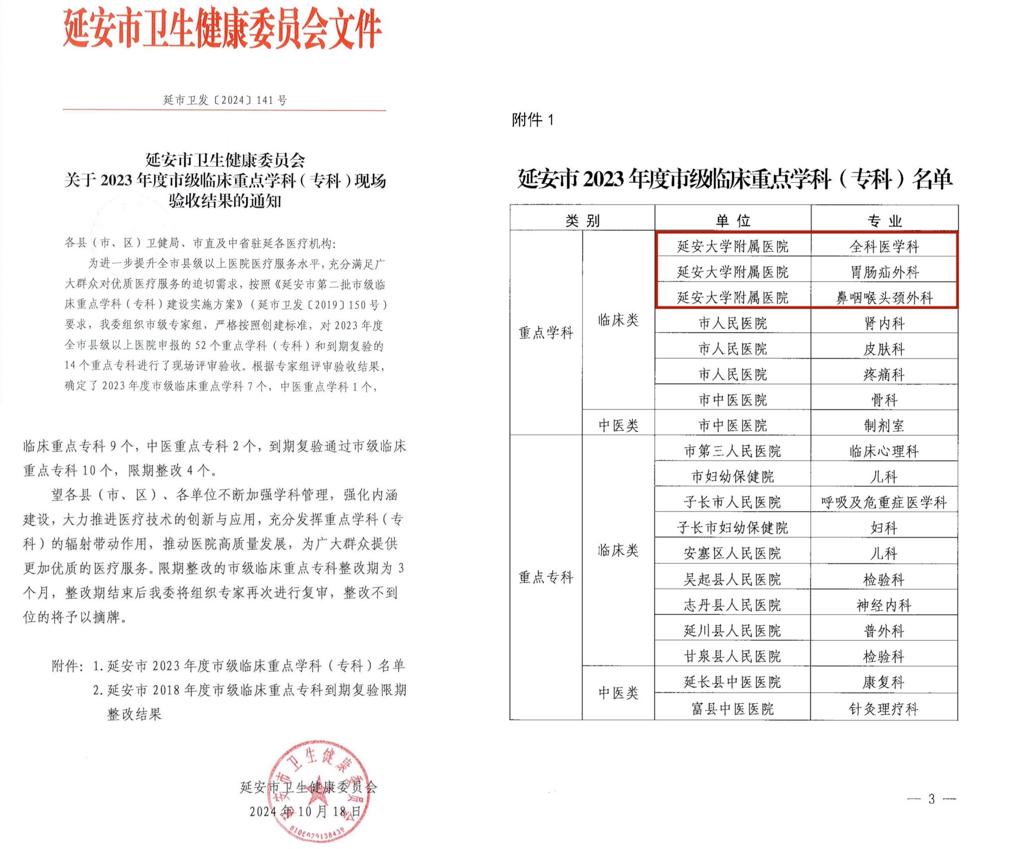 本网讯 近日,延安市卫生健康委公布了《关于2023年度市级临床重点学科(专科)现场验收结果》(延市卫发【2024】141号),beat365唯一官网附属医院全科医学科、胃肠疝外科、鼻咽喉头颈外科获批临床重点学科。