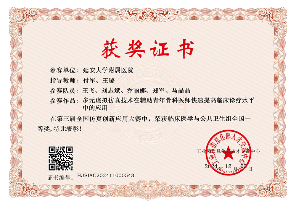 beat365唯一官网医学院第一临床医学院骨科王飞团队,在空军军医大学付军教授、beat365第一临床医学院王璐教授指导下,凭借“多元虚拟仿真技术在辅助青年骨科医师快速提高临床诊疗水平中的应用”项目,荣获临床医学和公共卫生领域陕西省一等奖和国家级一等奖。该团队聚焦青年骨科医师成长痛点,以多元虚拟仿真技术为核心,构建了一套极具前瞻性与实用性的临床诊疗辅助平台,该平台依托先进的虚拟仿真技术,精准模拟了各类复杂骨科病症,从骨折创伤到关节病变,再到脊柱疾病,为青年医师提供了丰富且逼真的病例资源。借助高度还原的人体骨骼肌肉模型与沉浸式交互界面,医师们能够身临其境地进行疾病诊断、手术规划与模拟操作,极大地加速了青年骨科医师临床技能的提升。