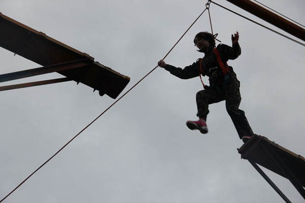 早上九点多钟,在绵绵细雨中活动拉开序幕。开营仪式上培训师讲解后,大家随机分成三队(铿锵玫瑰队、精英队、凤凰队),确定了各自的队名、队呼、队歌,并在自己队旗上绘制了徽标。训练项目形式多样,有团队合作的,有挑战自我的,也有激发爱心的,并要在规定时间内完成。其中,高空挑战项目跨越“断桥”、“走钢丝”、“狭路相逢”、穿越“缅甸桥”是挑战自我的项目,很多护士长相互鼓励、相互协作,克服困难,勇敢挑战,其表现赢得阵阵喝彩;“生命电网”中大家各抒己见,确定方案后,定人定网、统一指挥、团结协作,灵活应用工作中的“多人搬运法”,一次次的安全穿越“电网”,感受团结的力量和成功后的喜悦。最后一个项目是“角色扮演”集体项目,两人一组分别扮演盲人和哑巴,盲人在哑巴的帮助下穿越一段艰难的旅程,途中要爬陡坡、上台阶、穿丛林、踩荆棘、跨污水和避障碍等,在旅途中体验着奉献、协作、团队的快乐和被人帮助的温暖。