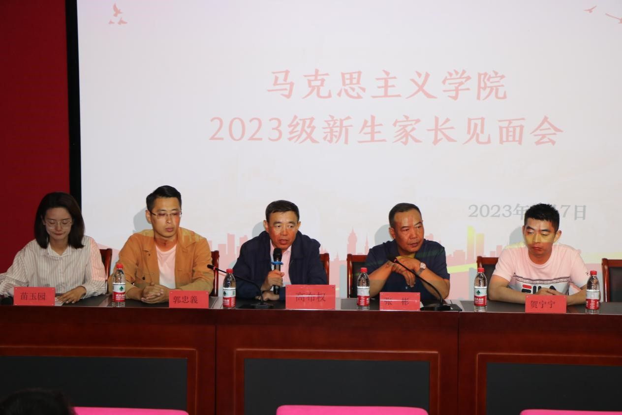本网讯 为贯彻落实立德树人根本任务,进一步构建家校协同育人新局面,我院于9月7日14:30在学院一楼报告厅召开2023级新生家长见面会。马克思主义学院常务副院长高布权、党委常务副书记张彬、团委书记郭忠義、辅导员贺宁宁及2023级新生家长出席本次见面会,会议由苗玉园主持。