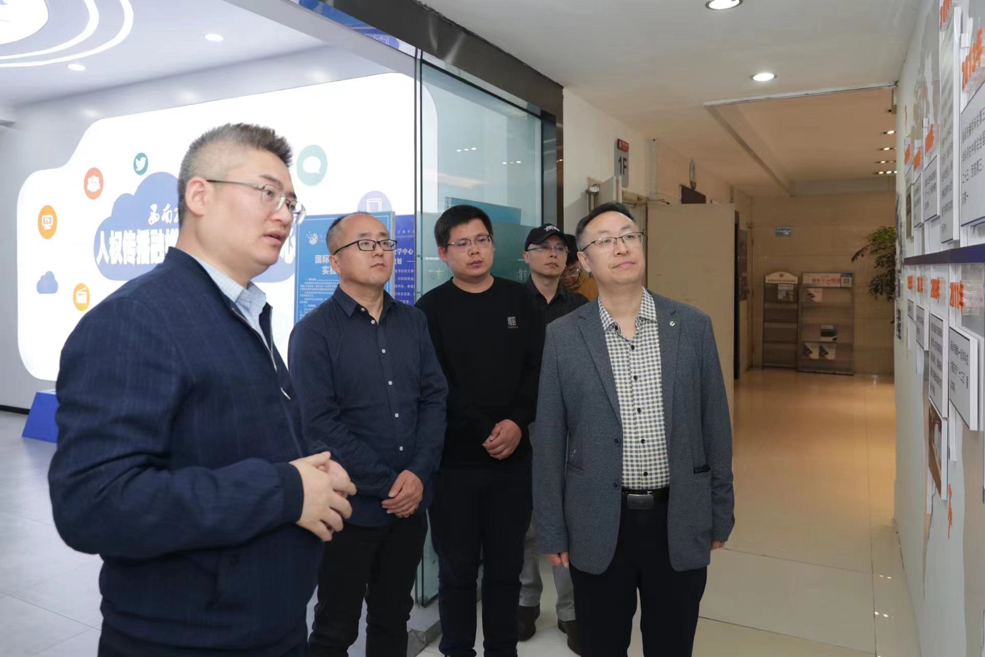 在西南政法大学新闻传播学院,王俊虎一行与西南政法大学新闻传播学院副院长蔡斐、张治中以及网络与新媒体系主任任正安、新闻传播学院副教授刘大明等座谈交流,重点考察了解该院网络与新媒体专业的课程设置与学生就业流向、新闻传播学一级学科学位授权点的申报与建设、延安时期红色新闻资源的挖掘与建设等,并在副院长蔡斐等陪同下实地参观考察了西南政法大学新闻传播学院融媒体实验室、资料室、文化墙、教职工休闲茶室等。双方表示,将进一步加强两院在融媒体实验室建设、延安时期红色新闻资源的开发与利用、新闻学人才培养等方面加强交流,共同推动新闻学学科创新发展。