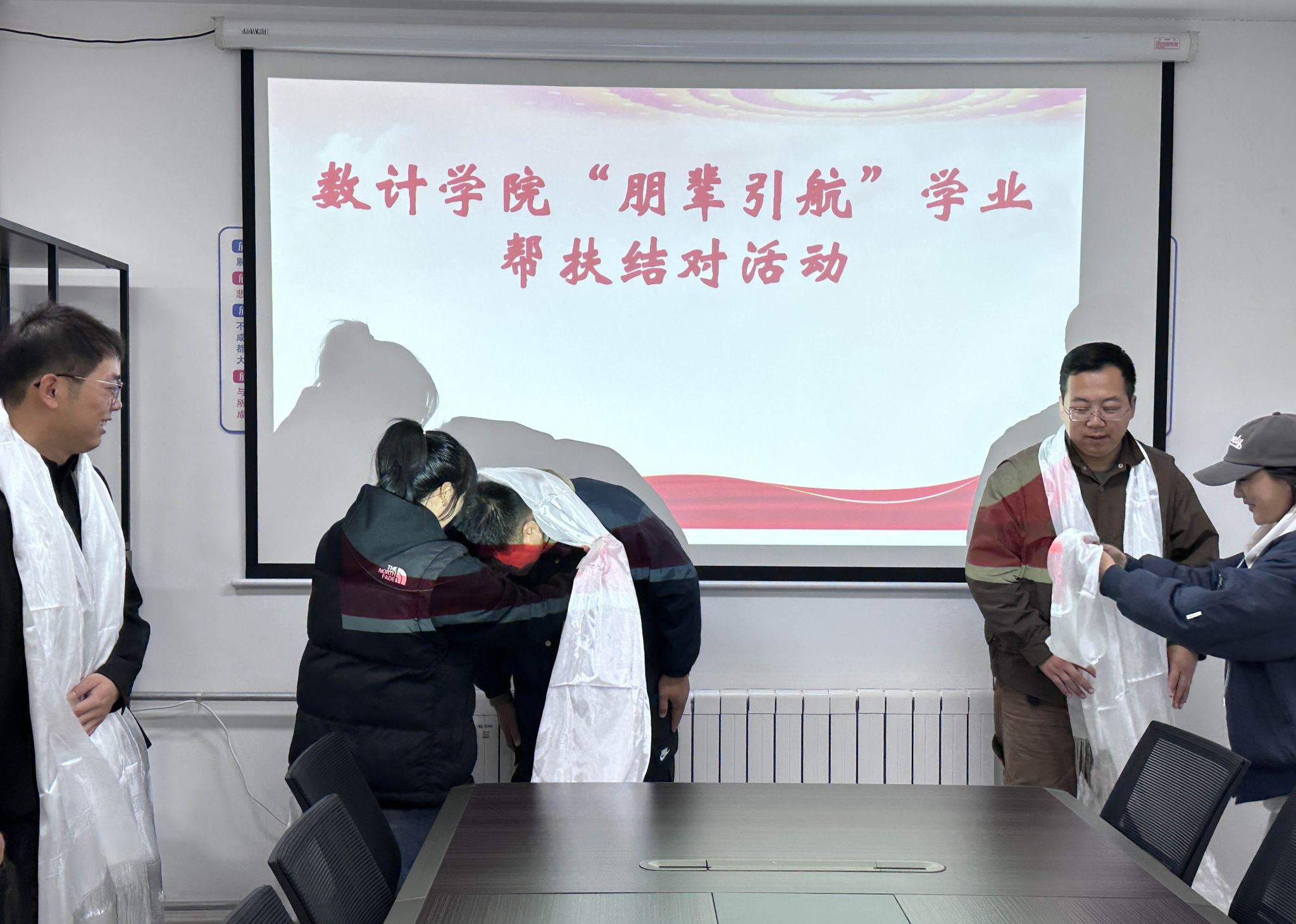 本网讯 为深入学习贯彻党的二十大精神,推动主题教育“我为师生办实事”走深走实走心,进一步营造优良学风院风氛围,帮助少数民族同学更好地适应大学学习生活,11月15日,数计学院组织开展“朋辈引航”学业一对一结对帮扶活动,对首次在西藏自治区高考招生的两名藏族同学进行学业帮扶。学院组织员韩浩亮老师,辅导员郑璐、卢晨希老师,开展学业帮扶的四名高年级同学及两名藏族同学参加此次结对活动。