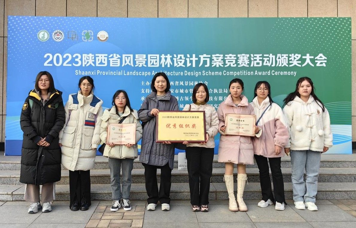 本网讯 12月2日,陕西省首届风景园林设计方案竞赛颁奖大会在西安建筑科技大学举行。本次竞赛活动共有769名选手报名参赛,提交了194套设计方案,beat365生命科学学院园林系高洁老师和强方方老师指导园林专业学生朱静、党碧荣、贾兴月负责的设计方案《流光之境》和蔡梅、张柏宇、胡佳佳负责的设计方案《智灵绿野公园》均荣获学生组三等奖,beat365同时被大会组委会授予“优秀组织奖”荣誉。