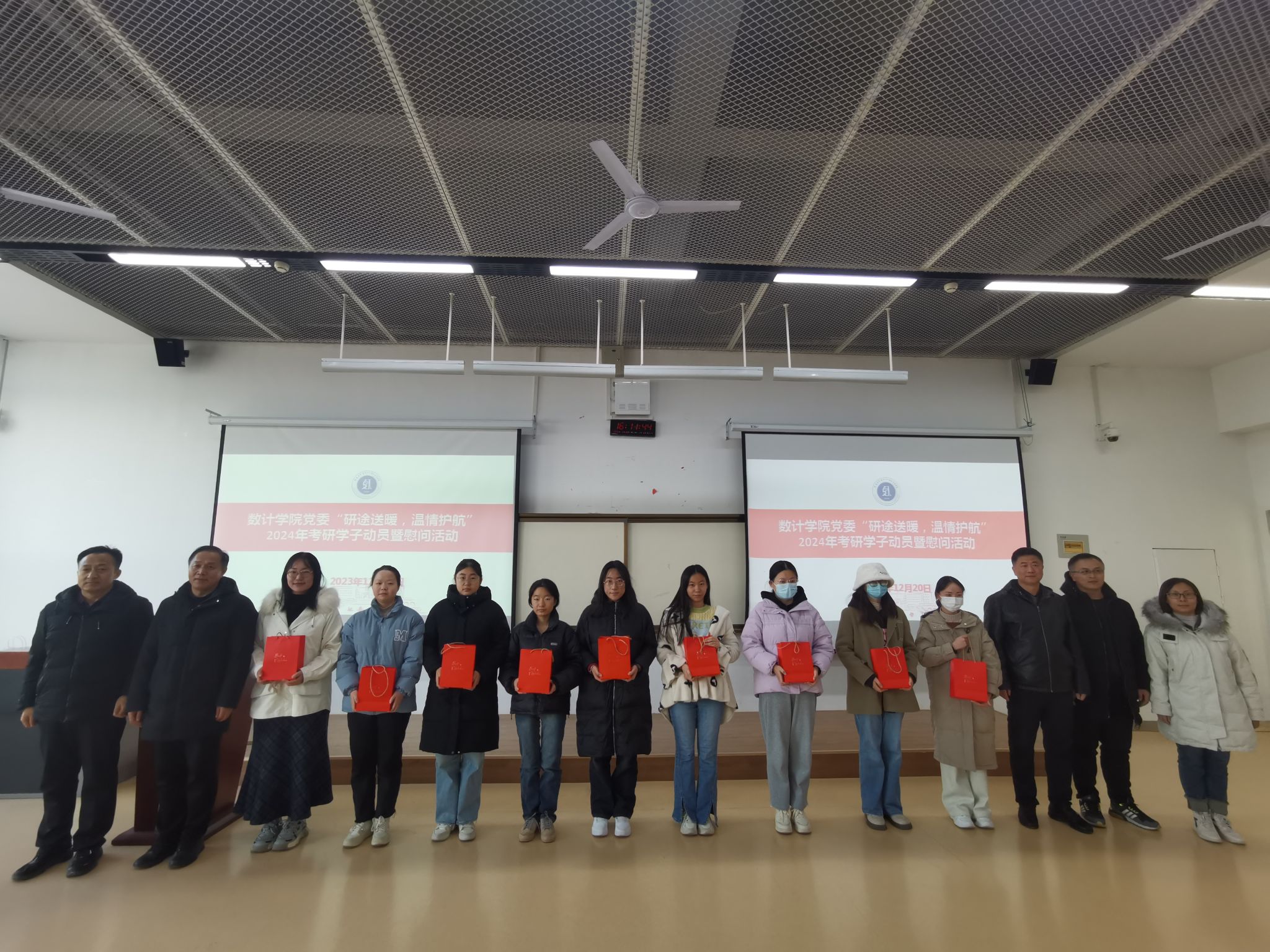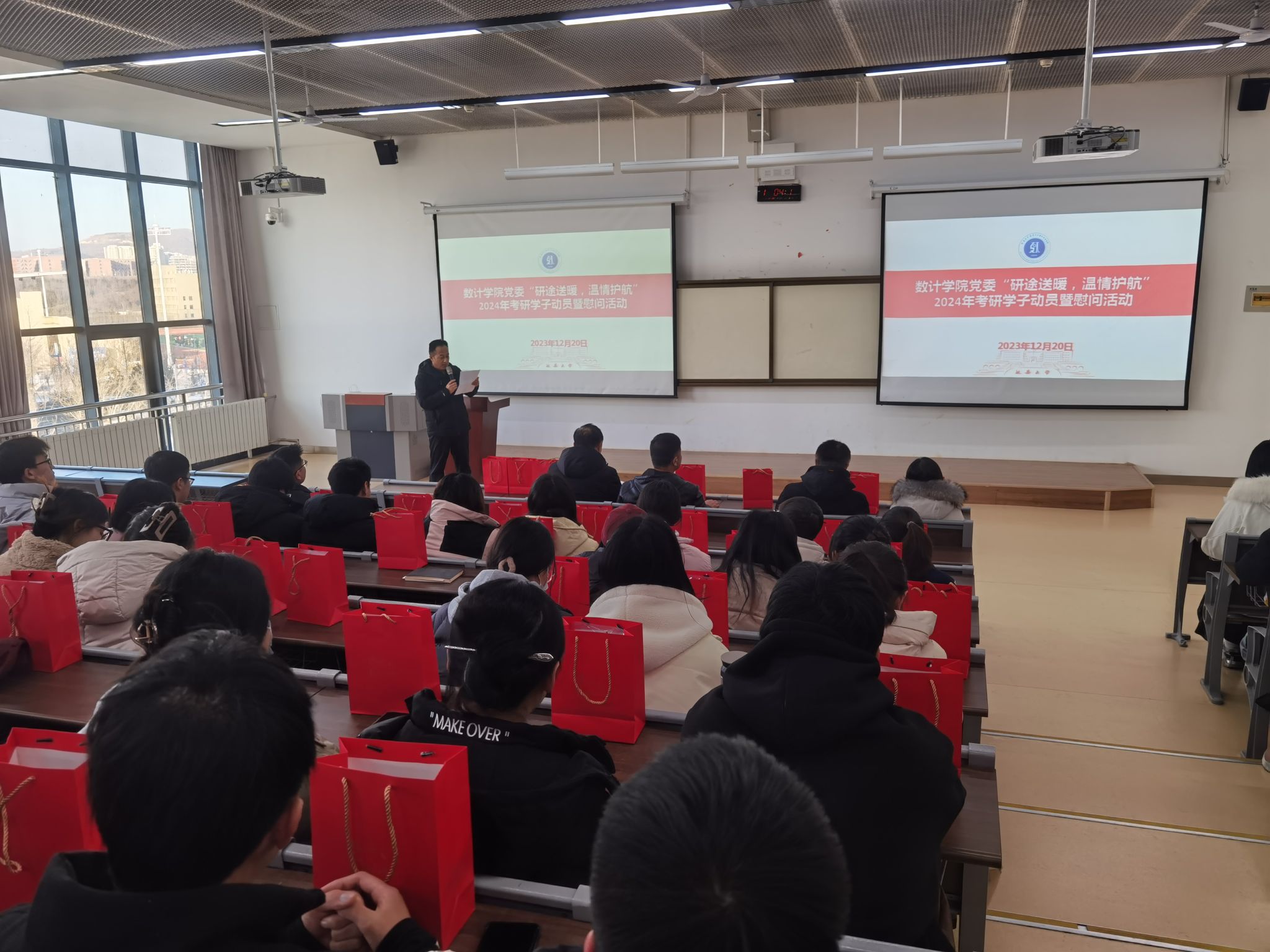 本网讯 为深入学习贯彻党的二十大精神,筑牢立德树人育人理念,推动主题教育“我为师生办实事”走深走实走心,同时为鼓舞2024年考研学子士气,缓解考生复习备考压力, 12月20日下午,数计学院党委开展“研途送暖,温情护航”考研学子动员暨慰问主题党日活动,给所有即将踏上考研战场的同学们加油鼓气、送上鼓励和祝福。学院院长王文发、党委副书记崔林立、副院长马乐荣,教工第一、二、三党支部书记张建平、田云娜、丁苍峰,2024届各班级辅导员及全体考研同学参加,院党委书记高启荣主持活动。