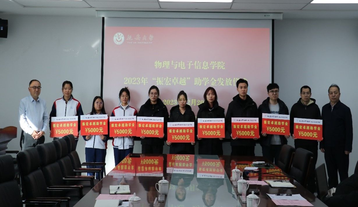 仪式上,张富春在致辞中代表学院对优秀校友马振宏先生捐资助学的善举以及对学院发展的支持表示感谢,对获得“振宏卓越”助学金的10位同学表示祝贺。他还就《物电学院“振宏卓越”助学金实施方案》进行了解读,并介绍了本年度评审的整体情况,宣布了获助学生名单。他指出,“振宏卓越助学金”的设立,旨在激励广大学生勤奋学习、努力进取,是学院人才培养工作的重要组成部分,希望同学们珍惜资助,再接再厉,以更加优异的成绩回报社会。
