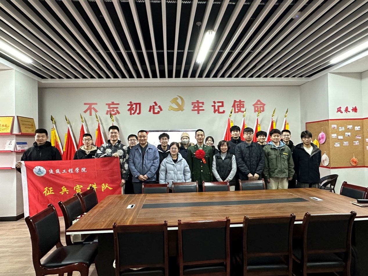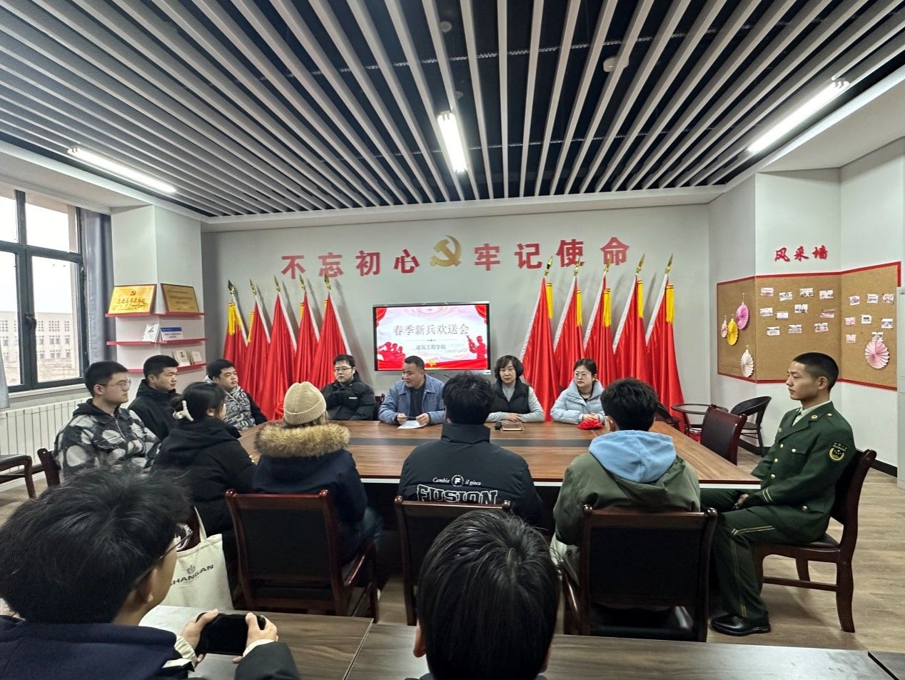 本网讯 3月4日上午,建工学院2024年春季新兵入伍欢送会在学院三楼党员活动室举行。院党委副书记李宁、班主任高飞、王姗姗、陈新岩、退役大学生士兵代表和班级同学代表参加了欢送仪式。