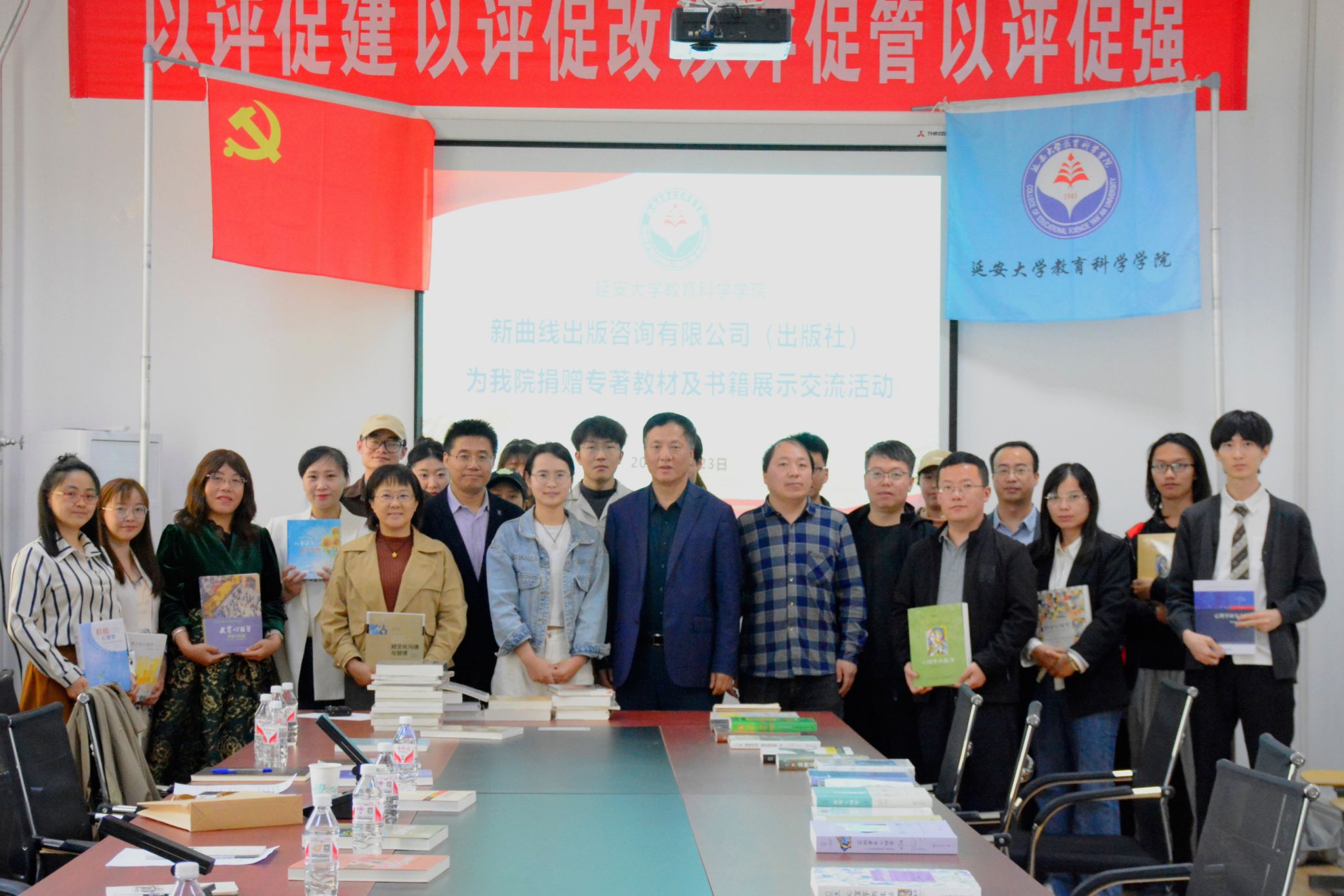 活动伊始,马小惠简要介绍了本次书籍捐赠活动目的,对新曲线出版咨询有限公司为教科院捐赠专业书籍表示热烈欢迎。刘瑞儒在致辞中简要介绍了教科院的基本情况,强调了在世界读书日举办此次活动的重要意义,对北京新曲线出版咨询有限公司服务社会支持教育事业的行为给予了充分肯定,对延大教科院的无私援助表示衷心感谢,同时表达了双方进一步加强交流合作的意愿。随后,王欣宇介绍了出版社的基本情况,表达了对延大教育事业的关注和支持,希望通过此次捐书活动能够为延大教科院师生的教学科研提供一定帮助,并表示今后还将会继续通过捐赠最新出版图书支持延大教科院事业发展。随后刘瑞儒代表学院接受了捐书,并向出版社回赠了纪念品。教科院教师代表崔荣宝和学生代表万译阳分别发言,对出版社捐赠图书表达感谢,表示将会在今后的教学、科研、学习中管理好利用好这批图书,使其发挥更大作用。