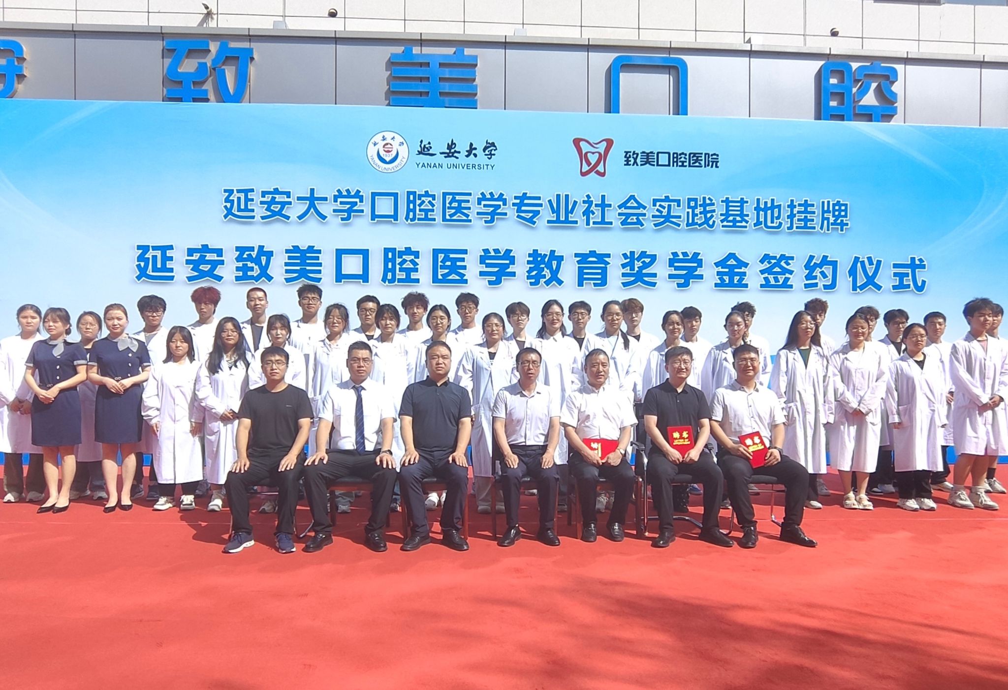 本网讯 为深入推进产教融合、加强校企合作, 6月14日上午,医学院联合延安致美口腔医院于致美口腔医院百米大道院区举行社会实践基地挂牌暨“延安致美口腔医学教育奖学金”签约仪式。医学院党委副书记罗世乾,党委组织员韩瑜,医学院就业指导科李荣华,延安致美口腔医院董事长、院长聂振轩,百米大道分院院长石飞,枣园分院院长郭强,“白求恩”医疗服务队队员及口腔医学专业学生参加本次活动。
