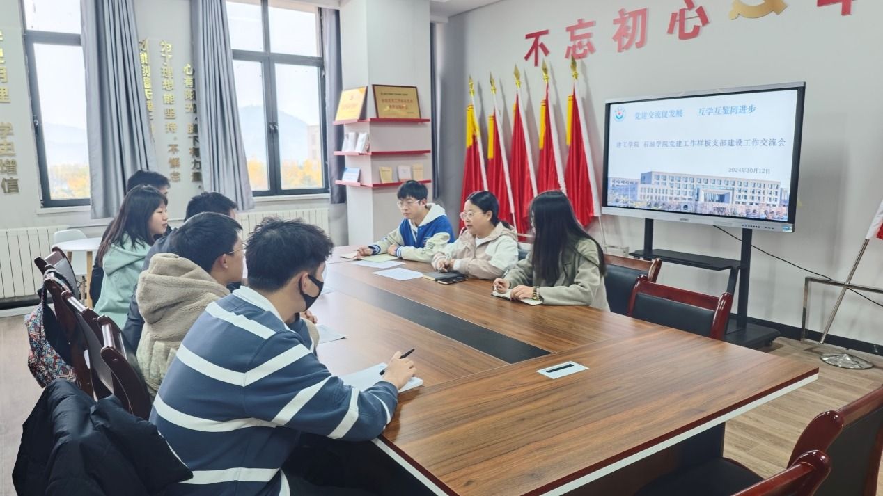 本网讯 10月12日下午,建工学院和石油学院在建工学院党员活动室举行学生党支部党建工作样板支部培育创建工作交流会。石油学院党委组织员郭洒洒、两院学生党支部委员和党员代表参加会议。会议由建工学院学生党支部书记高飞主持。