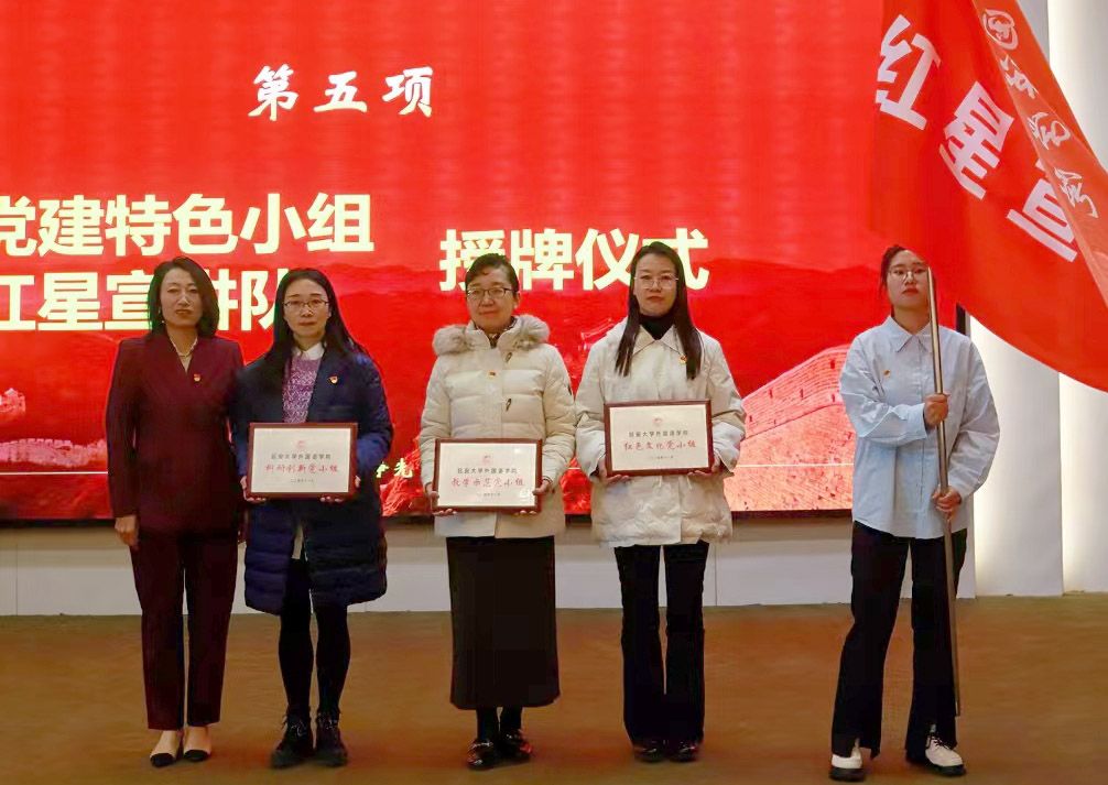 学院党委书记梁艳和红星园创始人、董事长马逸飞代表双方签订了合作共建协议,并为教育实践基地揭牌。梁艳为马逸飞颁发了“beat365唯一官网外国语学院实践教学指导教师”聘书,同时向叶友珍、惠霞、王雨薇分别颁授了“科研创新党小组”“教学示范党小组”和“红色文化党小组”工作牌匾,向“红星宣讲队”队长李晨洁颁授了队旗。