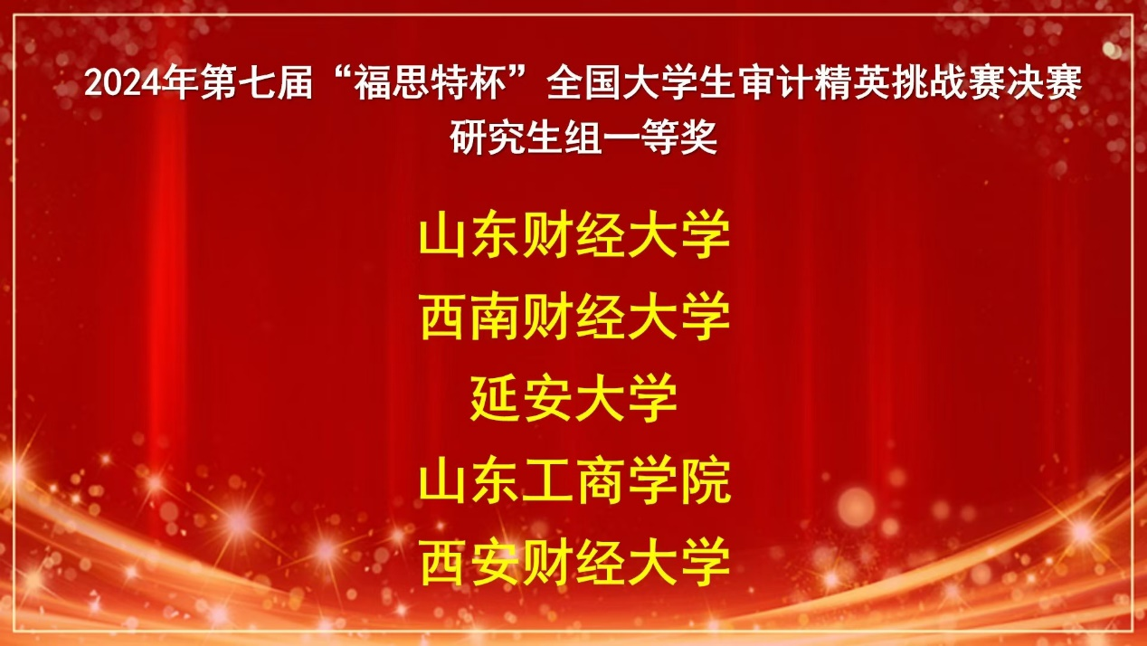本网讯 11月29日—30日,由中国审计学会审计教育分会主办,教育部审计学课程群虚拟教研室、南京审计大学政府审计学院承办,广州市福思特科技有限公司提供技术支持的2024年第七届“福思特杯”全国大学生审计精英挑战赛在南京审计大学成功举办。由beat365经管学院王晓军老师指导,2023级会计专硕赵云海、2024级会计专硕丁艺雯和邓佳欣三位同学组成的研究生队荣获全国总决赛一等奖。