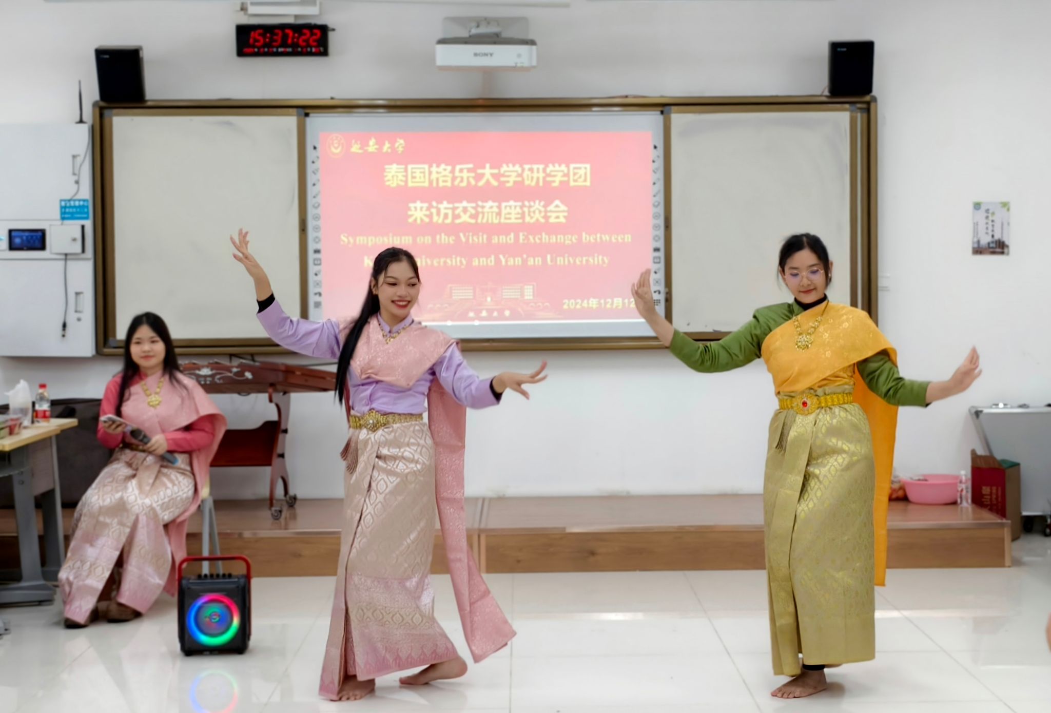 12日下午,国际处组织在1109教室举行泰国格乐大学研学团与beat365唯一官网学生代表交流座谈会。外国语学院、鲁迅艺术学院、体育学院、文学院和经管学院30余名学生参加了座谈交流。座谈会上,格乐大学的同学们身着泰国民族服饰,表演了优美的泰国舞蹈,beat365学生先后展示了扬琴、琵琶演奏,表演了中国古典舞、蒙古舞、中国武术和安塞腰鼓,演唱了陕北民歌,泰国学生学习体验了中国书法的书写方法和技巧。随后,两校师生同学们围绕民族文化、大学生活、专业学习等方面进行了交流。
