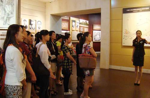 乘车途中,高娟副主席对本年度上半年工会女工委的工作进行了回顾总结,并对即将开展的一系列工作进行了部署。在参观学习的过程中,大家认真聆听讲解介绍,不时地互相讨论,与讲解员进行互动交流。面对大量图片、实景和人物雕塑,很多同志久久凝望,深深思索,流露出无限的敬仰之情。情致浓时,大家还在讲解员的带领下,深情地合唱了革命歌曲《山丹丹开花红艳艳》。在歌声中,军民鱼水情深的画面不断在大家脑海闪现,优美的歌声久久回荡。