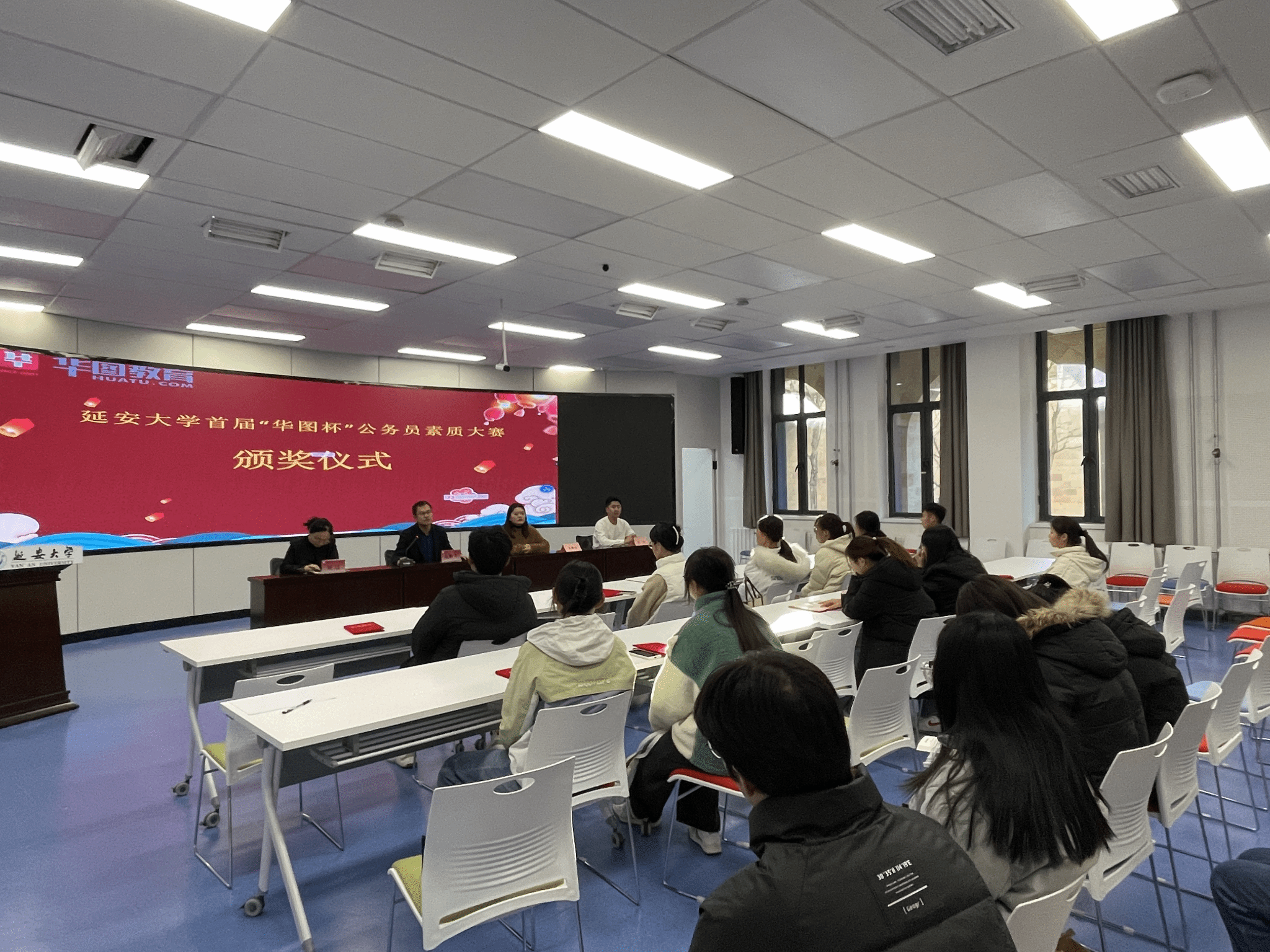 颁奖仪式上,华图延安分校校长介绍了赛事整体组织概况,赵鹏飞主任宣读获奖名单,颁奖嘉宾为获奖同学一一颁发了奖金、奖品及获奖证书,获奖同学表示一定不负时光,努力备考,争取上岸,为校争光。