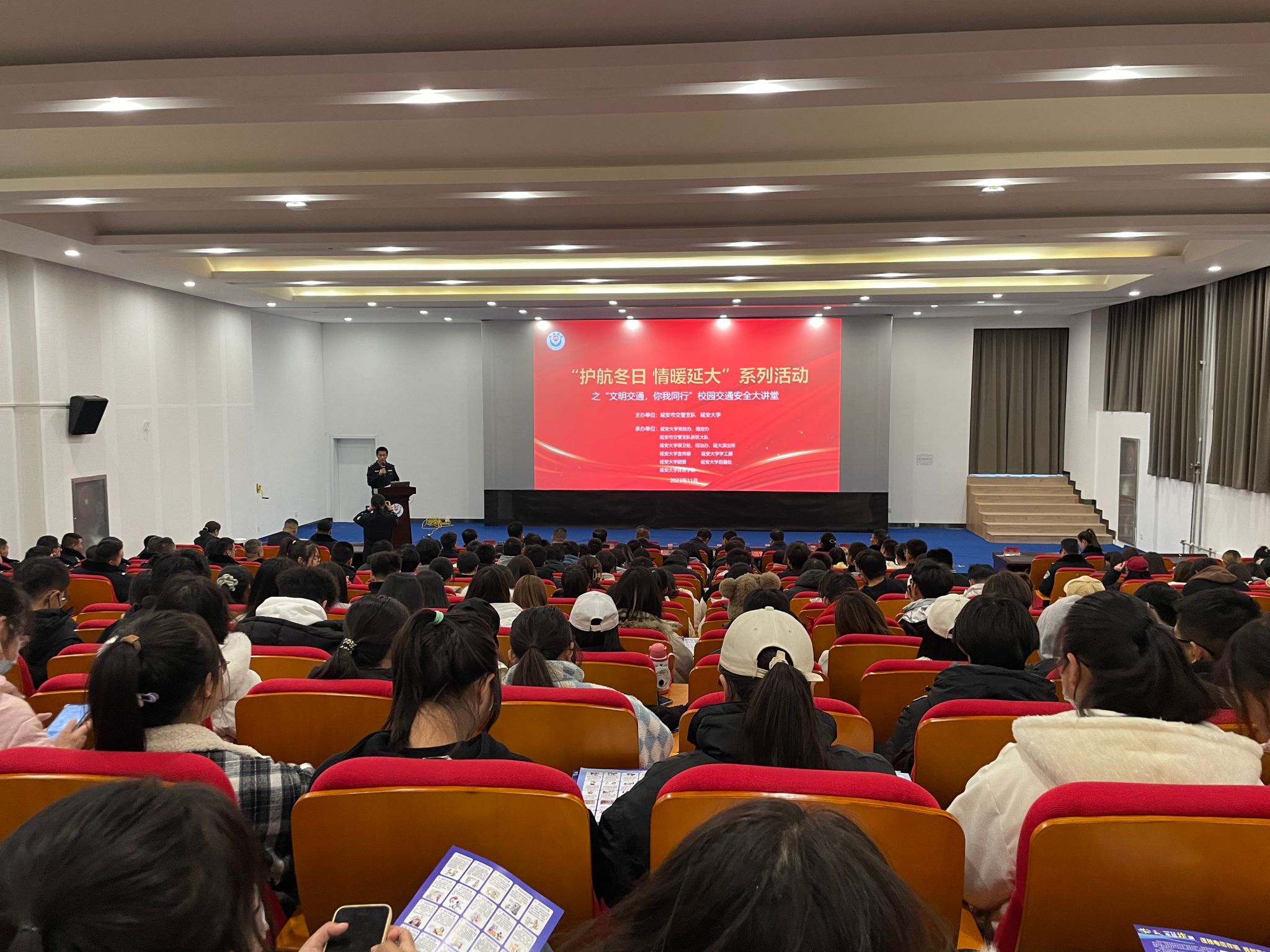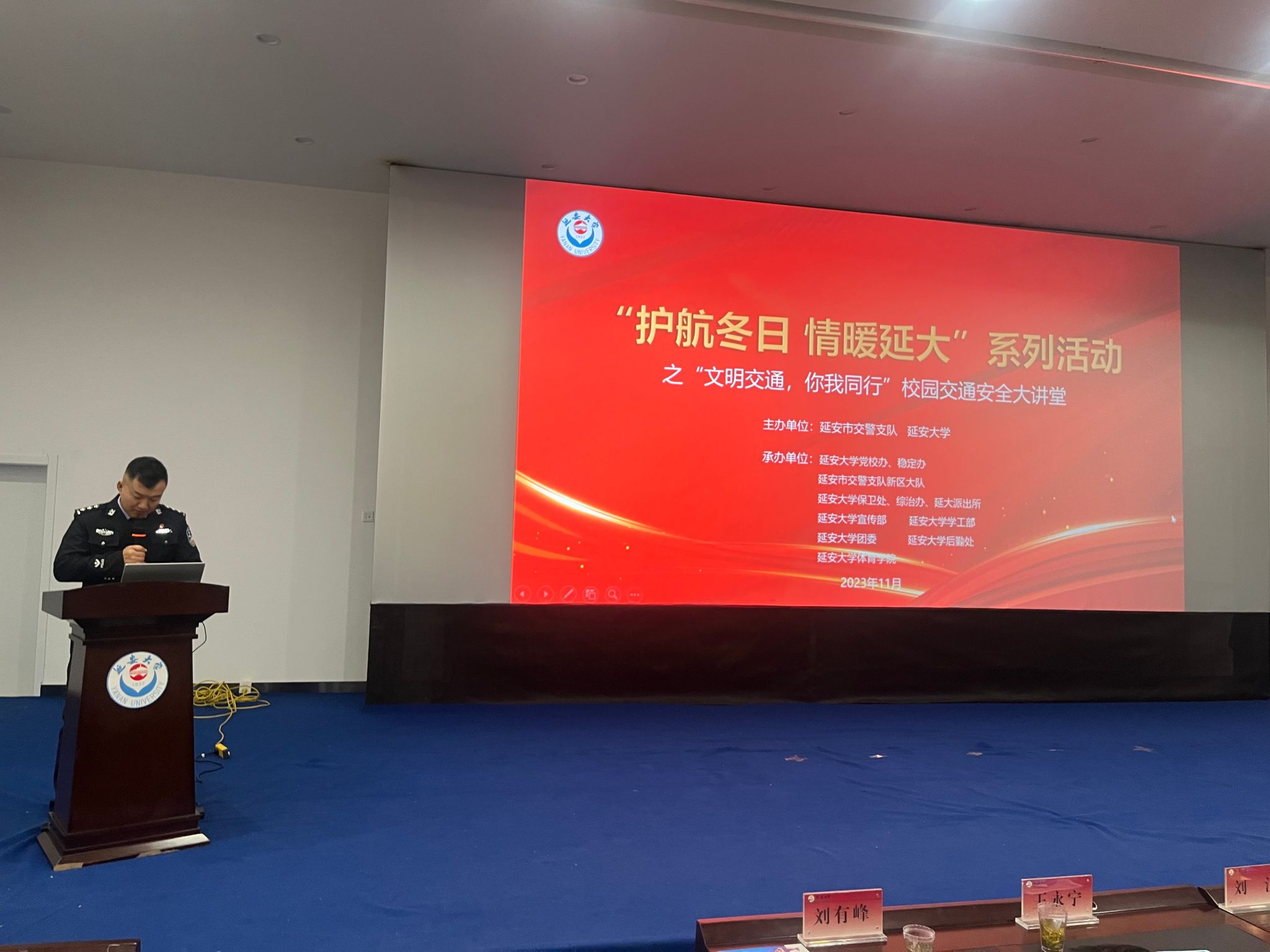 本网讯 为普及校园交通安全常识,提升交通安全意识,营造良好的校园交通环境。11月29日下午,beat365在新城校区大学生活动中心组织开展“护航冬日,情暖延大”系列活动之“文明交通,你我同行”校园交通安全大讲堂活动。延安市公安局交警支队新区大队副大队长李欣阳,beat365副校长吕达、各有关职能部门负责人、学院书记、辅导员及学生代表400余人参加活动。活动由保卫处副处长王海洋主持。