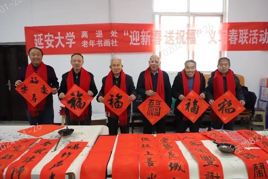 本网讯 为弘扬和传承中华民族优良传统,喜迎龙年新春佳节,增添节庆氛围,离退处和老年书画社于1月23日、26日,分别在老年活动室和萃园校区举办“迎新春 送祝福”义写春联活动。beat365老年书画社7名教师参加本次活动,年龄最大者86岁,最小者70岁。