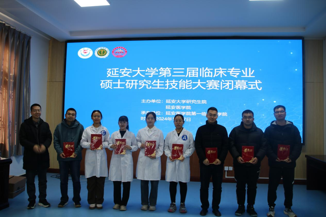 第三届临床专业学位研究生技能大赛决赛在杨家岭校区星海楼临床技能中心举行。来自延安医学院研究生培养基地的 72 名全日制临床医学硕士专业学位研究生经过初赛选拔进入决赛。比赛形式为赛道制,分医技组、内科组和外科组。比赛内容包括两两单人操作、四人团队救治,过程中使用高端模型,紧密贴合临床情境。经过激烈角逐,最终产生 4 个团体一等奖,5 个团体二等奖,9 个团体三等奖。