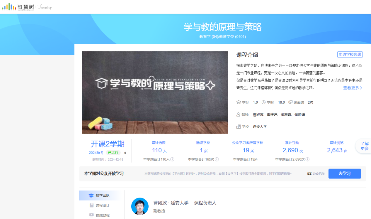本网讯 近日,由研究生院立项建设,教科院曹殿波副教授为项目负责人的研究生“一流课程”《学与教的原理与策略》(项目编号:YJG202301)在智慧树网站正式上线。该研究生“一流课程”由曹殿波、霍婷婷、张海霞、张莉靖四位教师录制,面向全国教育类专业在校生及教师开放选课。此慕课的推出,标志着beat365教育类专业研究生教育在课程建设方面又迈出了重要一步。