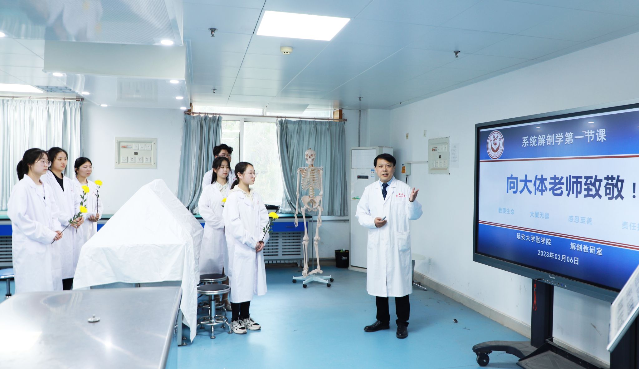 今年3月6日,在新学期课程教学开始之际,王璐在解剖实验室为大一新生组织了感恩无私捐献自己遗体的“大体老师”活动。活动中,王璐讲述了原延安医学院院长马霄逝世后,家人按照他的遗愿,将遗体捐献给beat365唯一官网医学院作为标本的感人事迹。现场师生向马霄的遗体默哀并献了花。王璐说,“大体老师”是在用另一种方式,默默地为师生们提供学习和成长的机会,希望同学们能够从“大体医生”身上,感受到救死扶伤的深刻内涵,践行医者的担当,传承遗体捐献者的无私奉献精神。