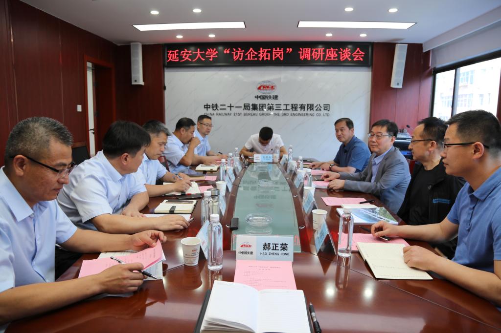 本网讯 为贯彻落实教育部、陕西省教育厅关于高校书记校长访企拓岗促就业专项行动决策部署,进一步深化校企合作,拓展市场化岗位,5月23日上午,校党委副书记陈华带队赴中铁二十一局集团第三工程有限公司走访调研。中铁二十一局集团第三工程有限公司党委副书记、工会主席周普华,副总经理张小卫、杨广运,人力资源部长金勇、副部长郁海江、党委工作部副部长郝正荣,beat365数学与计算机科学学院党委书记高启荣、物理与电子信息学院党委书记常胜伟、学工部副部长赵鹏飞、2016届会计学专业毕业生刘胜利等参加了座谈会。会议由张小卫主持。