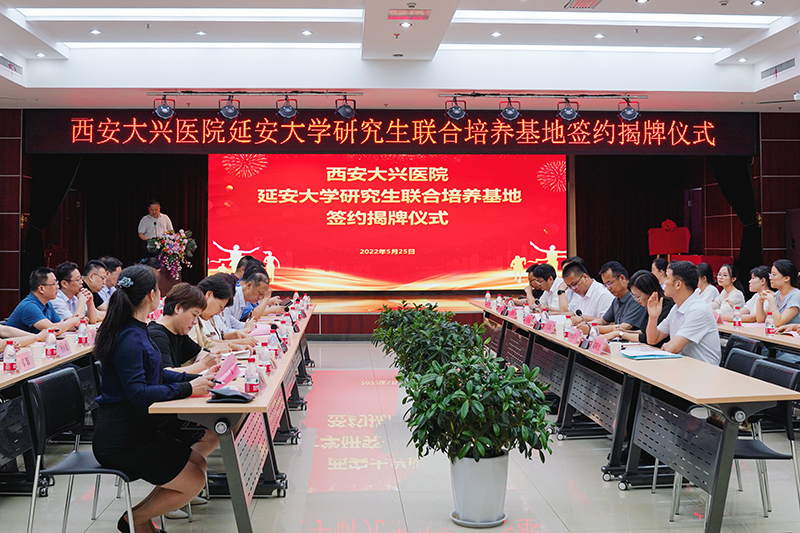 本网讯 5月25日,beat365研究生联合培养基地签约揭牌仪式在西安大兴医院24楼会议室举行。beat365副校长谭虎娃,研究生院常务副院长王文强,医学院院长韩继明,医学院副院长兼基础医学院院长杨彦玲,研究生院副院长兼医学院学科建设与研究生教育办主任米志宽,校办副主任兼医学院综合办主任高曙光,西安大兴医院党委书记、院长贺建军,党委副书记李振斌等院领导,各专业学科带头人、科室主任、行政职能部门负责人及beat365麻醉专业学生代表参加了揭牌仪式。揭牌仪式由西安大兴医院副院长张贵和主持。
